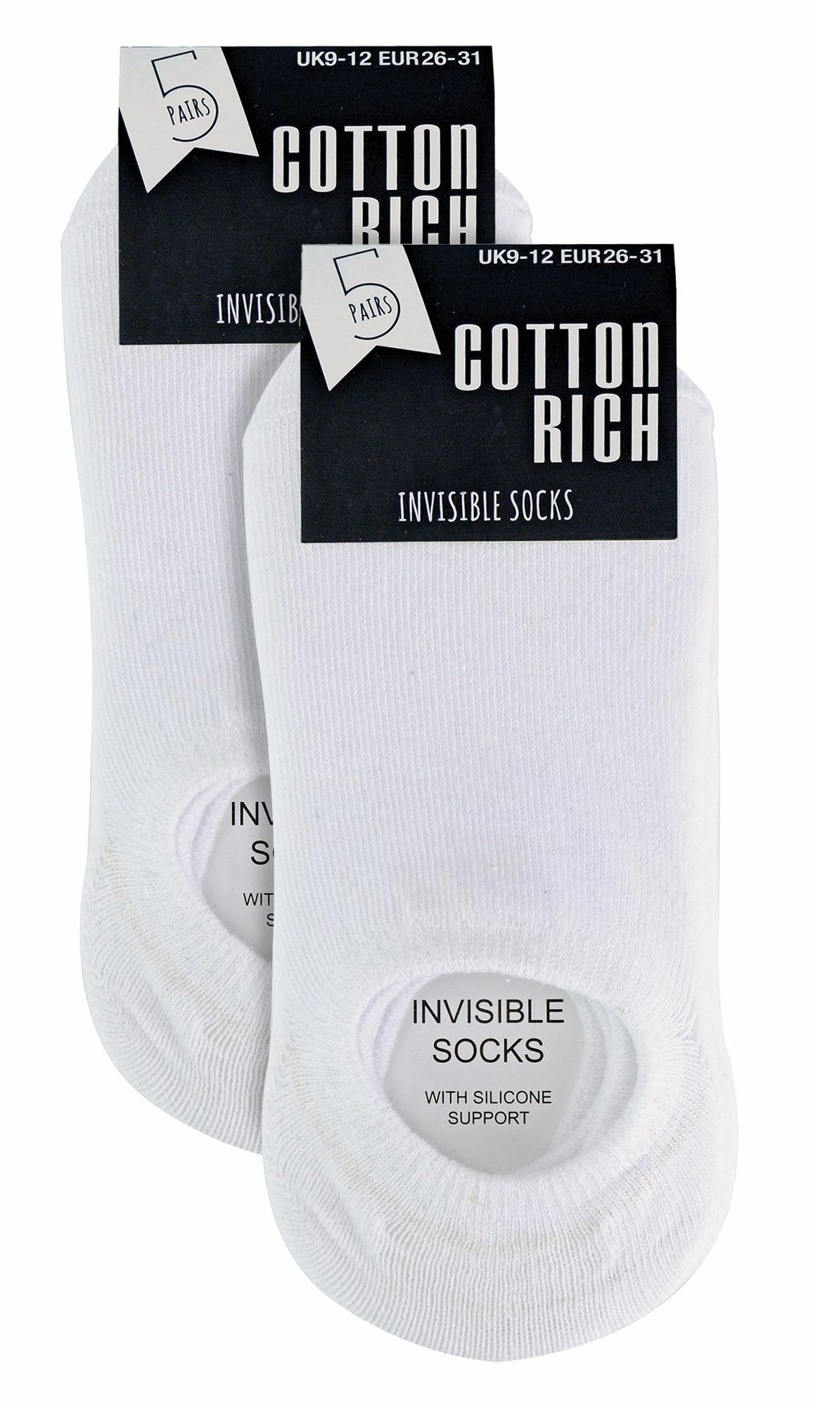 Kids 10 Pack Invisible Trainer Socks With Silicone GripsIf you’re looking for a fun and comfortable sock that will make your kids’ feet feel great, look no further! These Kids Invisible Trainer Socks with Silicone Grips are the way to go!These White Invisible Socks with Silicone Grip are not only perfect for everyday wear and make all their favourite shoes fit like a glove but they come in a great 10 pair value pack which is great value for money, making sure they’ve got plenty to last!The low cut invisible style means they won’t be tripping over their own feet and makes them great for trainers and other shoes with a thinner sole, the best part? They have silicone grips along the bottom to keep them from slipping off your child’s feet when they’re running around outside.These socks are designed to provide a comfortable, low-cut sock that is ideal for everyday wear. The cotton rich fibres make sure that they’re super soft, comfortable and capable of withstanding the busy day. Available in White, the pack comes in three sizes: 3-7 years, 8-11 years, and 11-14 years. They’re machine washable, too so you can throw them in with all your other laundry without worrying about shrinking them!Extra Product DetailsKids Invisible Socks10 Pair Value PackCotton Rich MaterialLow Cut Invisible StyleGreat For TrainersSilicone Support GripsIdeal For The EverydayAvailable In White3 Size OptionsMachine Washable