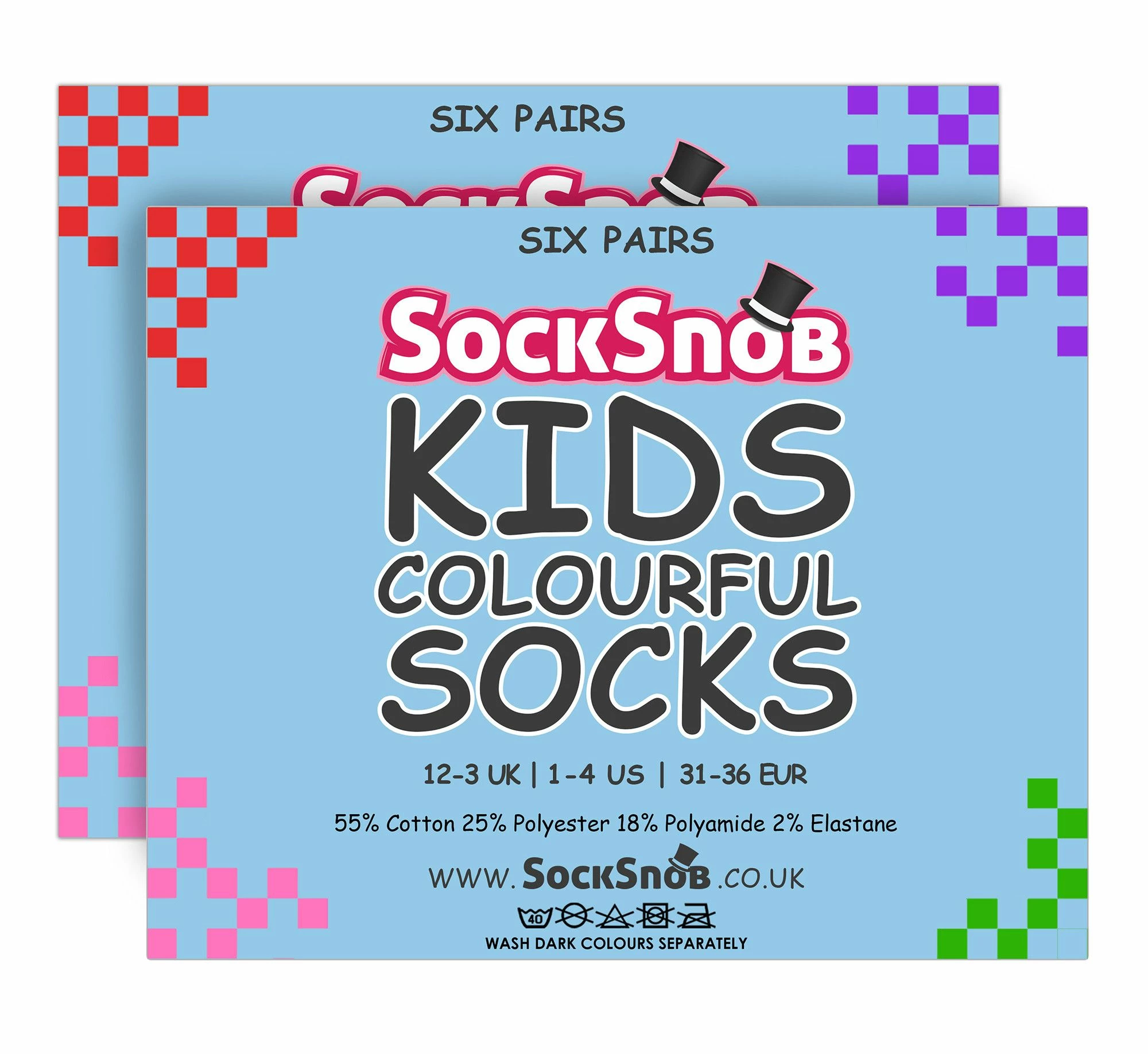 Sock Snob Kids 12 Pair Value Pack Colourful Cotton SocksReliable everyday socks are an essential for every child, whether they are using them for school or for casual wear. That’s why these great value packs of kids colourful socks in over 8 different colours are essential!These cotton socks are soft and comfortable as well as bringing a decent selection of bright colours to your child’s sock drawer. Not only that, you’ll find these socks are made to be great value for money as they come in a 12 pack pair. Ideal for stocking up your little ones sock drawer for the new term!These socks have a 55% cotton content to increase softness and comfort. Cotton as a fibre is very breathable, so in terms of suiting all year round these socks are perfect. They will cool your feet down in the summer and will hold the heat in during the winter. In this 12 pair value pack you’ll find that these socks will last and will be reliable throughout any activity including school and other activities. There are 8 colours to choose between and are available in 2 sizes: 12-3 UK 1-4 US 31-36 EUR and 9-12 UK 10-1 US 27-31 EUR. They are made out of 55% Cotton, 25% Polyester, 18% Polyamide and 2% Elastane and are machine washable.Extra Product DetailsKids Colourful Socks11 Plain Colours2 Size OptionsSoft and Comfortable12 Pair Value PackValue For MoneyGreat for School and Casual WearMachine Washable