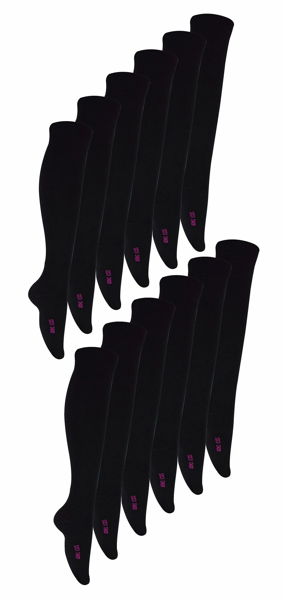 Girls 12 Pair Value Pack Extra Long Bamboo SocksThese Girls Extra Long Bamboo Socks are the perfect socks for keeping your little one’s feet cosy and comfortable. They come in a great 12 pair value pack so you can stock up their sock drawer to last! They’re made with super-soft bamboo that keeps their feet cool in summer and warm in winter.Bamboo materials help the wearer keep feet pleasantly fresh all day, with thanks to the hollow structure of the fibres, making bamboo a super absorbent material. This means that bamboo effectively wicks moisture and sweat away from the skin.Bamboo socks are breathable and up to four times more absorbent than cotton socks. The silky-feel bamboo blend fabric has antibacterial properties which are able to resist odours and fungal formation and the handlinked toe seams are created so that they won’t rub or chafe.Whether they’re running around at home or have a busy day at school, these bamboo socks will get them through the day with their effective moisture wicking and breathable properties. These socks feature elasticated comfort cuffs so their legs feel comfortable in wearing these soft socks.These socks come in a pack of 12 pairs, they are available in the colours of Black, Navy White & Grey. They’re made from 77% Viscose (from bamboo), 22% Polyester, 2% Elastane and are available in 2 kids sizes: 12-3 UK (30-36 EUR, 13-4 US) & 9-12 UK (27-30 EUR, 10-1 US). They are machine washable.Extra Product DetailsGirls Extra Long Bamboo Socks12 Pairs Per PackSuper Soft BambooGreat Value For MoneyHandlinked Toe SeamsBreathable PropertiesMoisture WickingPerfect For SchoolSuper Absorbent4 Colour OptionsKnee High Length2 Sizes: 12-3 UK & 9-12 UKMachine Washable