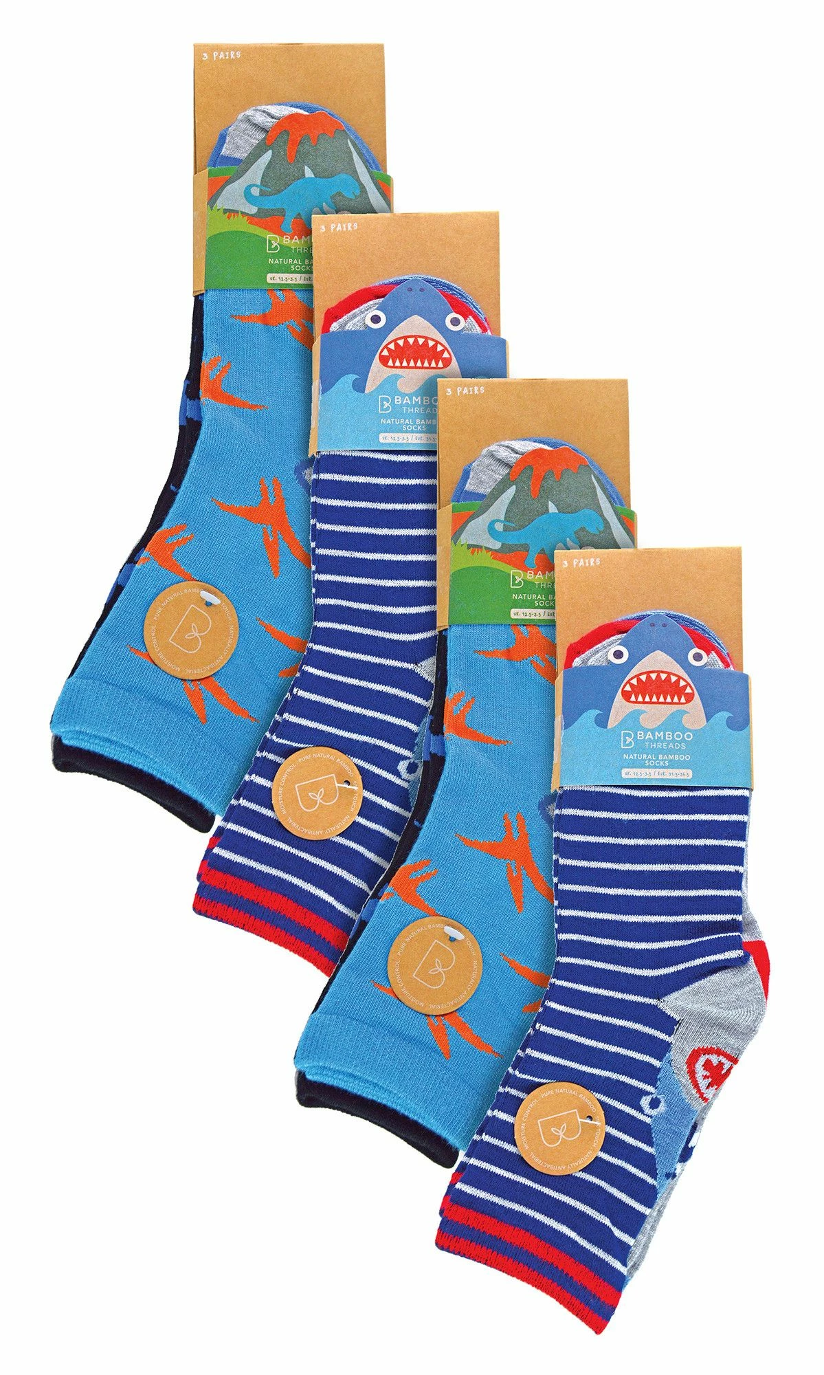 Kids 12 Pack Bamboo Novelty Patterned Ankle SocksIf you’re looking for a great gift idea or stocking stuffer idea, look no further! These 12 Pair Pack of Kids Novelty Ankle Socks are the perfect choice.Your kids will love these novelty socks as they’ve got fun colours and funky patterns of cool Sharks & Dinosaurs or Dogs & Unicorns that will make them stand out from their friends!These socks are made with super soft bamboo fibres, making them very comfortable to wear and very durable. Bamboo is known as one of the softest materials out there as well as having natural moisture wicking abilities so they can spend all day in their new socks!We know how frustrating it is when one sock goes missing and never gets found again after washing day, so we’ve got your kids covered with our 12 pair value pack so not only are they great value for money but you can stock up their sock drawer on a budget! The kids sock pack comes in three different sizes: 3-7 years, 8-11 years, and 11-14 years, so you can find the pair that fits them best! They’re also machine washable, so you can throw them in the washing machine and they’ll come out looking just like new again!Extra Product DetailsKids Novelty Socks12 Pair Value PackSharks & Dinosaur PatternsDogs & Unicorn PatternsFunky & ColourfulSoft Bamboo FibresA Great Gift IdeaValue For MoneySuper Soft & Comfortable3 Size Options70% Bamboo Fibre, 27% Polyester, 3% ElastaneMachine Washable