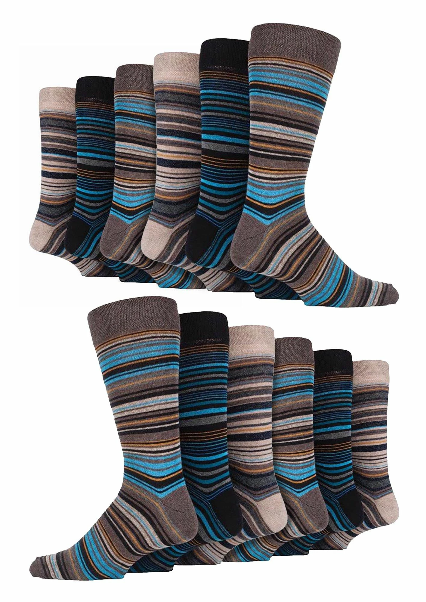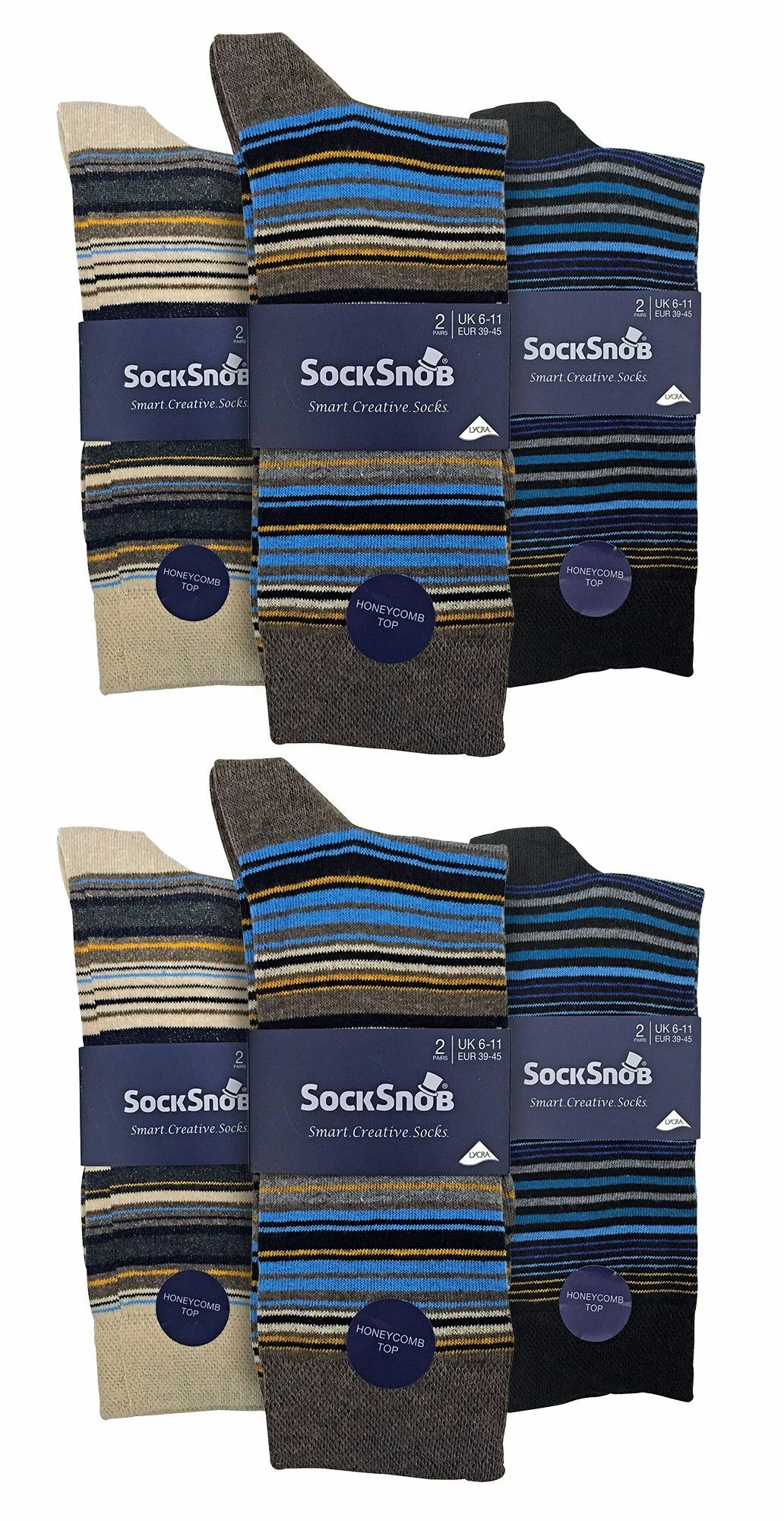 12 Pair Value Pack Men’s Sock Snob Premier Collection Cotton SocksWhen you buy these 12 pack pair of socks from Sock Snob Branded, you get value for money as well as quality at an affordable price point without compromising on comfort or style!Men’s patterned dress socks are a must-have for every man. They’re great for any occasion and they come in 7 different styles/colours.These socks are super soft and very comfortable to wear. The honeycomb top enhances comfort while the flat toe seam helps prevent abrasion caused by friction against your feet while walking or running around all day long.They’re made from 80% cotton to ensure that you get the most comfort out of them. They have flat toe seams to ensure durability and are machine washable so you can keep them clean even after long wear. The high moisture wicking abilities and temperature control will keep your feet warm in the winter and cool in the summer.There are 7 modern styles to choose between, 5 striped styles named after iconic cities with an additional 2 styles in plain Black & Black, Navy & Grey. They are made from: 80% Cotton 10% Nylon 7% Polyester 3% Lycra and are machine washable.Extra Product DetailsMen’s Patterned Dress SocksSock Snob BrandedSuper Soft CottonGreat Socks For Any OccasionHoneycomb Top To Enhance Comfort7 Style/Colour OptionsGreat Value For MoneyMen’s One Size: 6-11 UK80% Cotton 10% Nylon 7% Polyester 3% LycraFlat Toe SeamMachine Washable