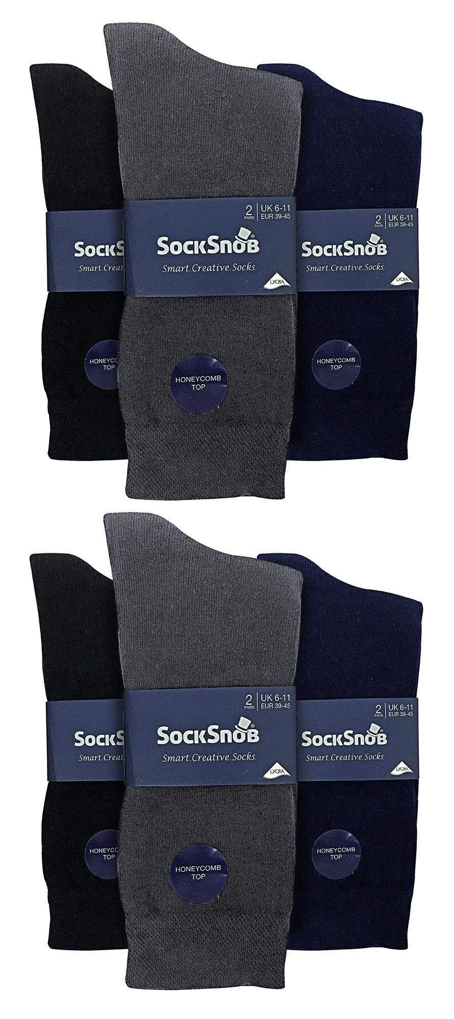 12 Pair Value Pack Men’s Sock Snob Premier Collection Cotton SocksWhen you buy these 12 pack pair of socks from Sock Snob Branded, you get value for money as well as quality at an affordable price point without compromising on comfort or style!Men’s patterned dress socks are a must-have for every man. They’re great for any occasion and they come in 7 different styles/colours.These socks are super soft and very comfortable to wear. The honeycomb top enhances comfort while the flat toe seam helps prevent abrasion caused by friction against your feet while walking or running around all day long.They’re made from 80% cotton to ensure that you get the most comfort out of them. They have flat toe seams to ensure durability and are machine washable so you can keep them clean even after long wear. The high moisture wicking abilities and temperature control will keep your feet warm in the winter and cool in the summer.There are 7 modern styles to choose between, 5 striped styles named after iconic cities with an additional 2 styles in plain Black & Black, Navy & Grey. They are made from: 80% Cotton 10% Nylon 7% Polyester 3% Lycra and are machine washable.Extra Product DetailsMen’s Patterned Dress SocksSock Snob BrandedSuper Soft CottonGreat Socks For Any OccasionHoneycomb Top To Enhance Comfort7 Style/Colour OptionsGreat Value For MoneyMen’s One Size: 6-11 UK80% Cotton 10% Nylon 7% Polyester 3% LycraFlat Toe SeamMachine Washable