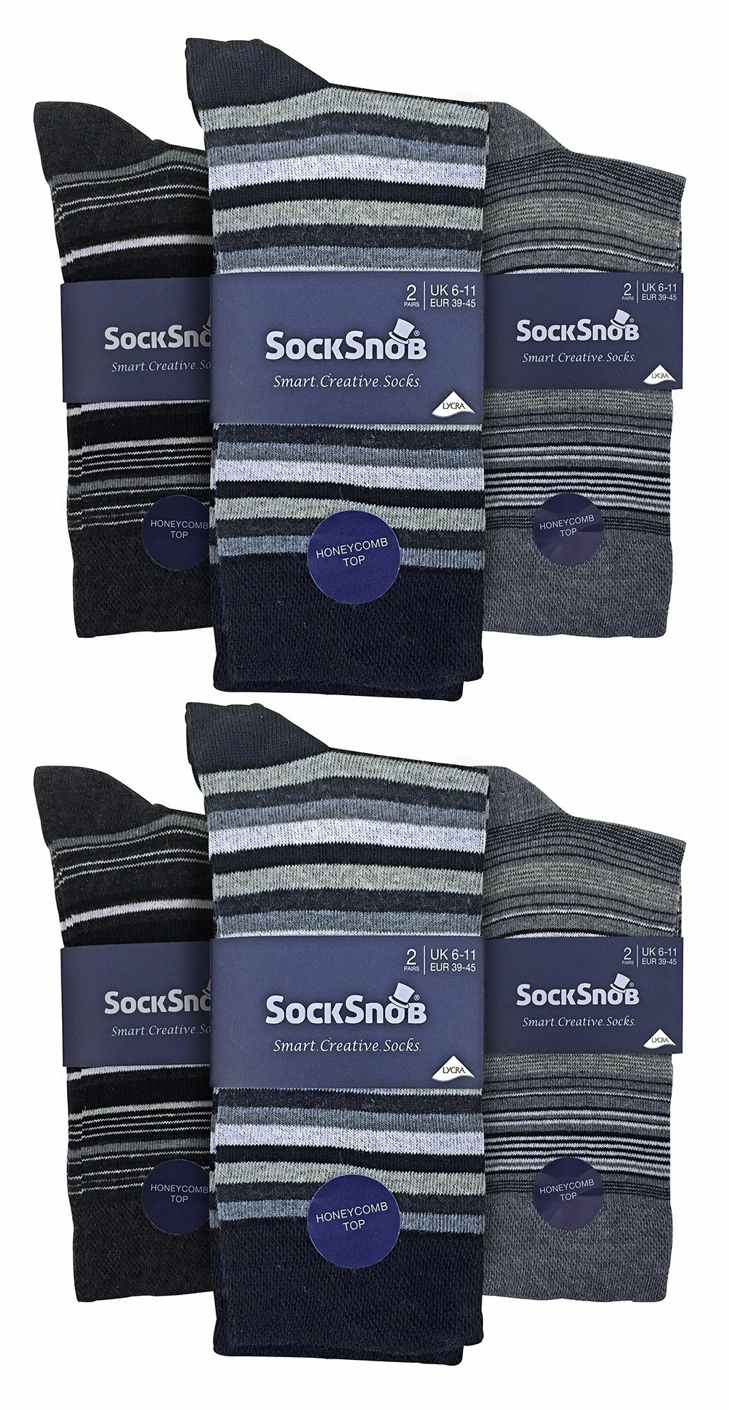 12 Pair Value Pack Men’s Sock Snob Premier Collection Cotton SocksWhen you buy these 12 pack pair of socks from Sock Snob Branded, you get value for money as well as quality at an affordable price point without compromising on comfort or style!Men’s patterned dress socks are a must-have for every man. They’re great for any occasion and they come in 7 different styles/colours.These socks are super soft and very comfortable to wear. The honeycomb top enhances comfort while the flat toe seam helps prevent abrasion caused by friction against your feet while walking or running around all day long.They’re made from 80% cotton to ensure that you get the most comfort out of them. They have flat toe seams to ensure durability and are machine washable so you can keep them clean even after long wear. The high moisture wicking abilities and temperature control will keep your feet warm in the winter and cool in the summer.There are 7 modern styles to choose between, 5 striped styles named after iconic cities with an additional 2 styles in plain Black & Black, Navy & Grey. They are made from: 80% Cotton 10% Nylon 7% Polyester 3% Lycra and are machine washable.Extra Product DetailsMen’s Patterned Dress SocksSock Snob BrandedSuper Soft CottonGreat Socks For Any OccasionHoneycomb Top To Enhance Comfort7 Style/Colour OptionsGreat Value For MoneyMen’s One Size: 6-11 UK80% Cotton 10% Nylon 7% Polyester 3% LycraFlat Toe SeamMachine Washable