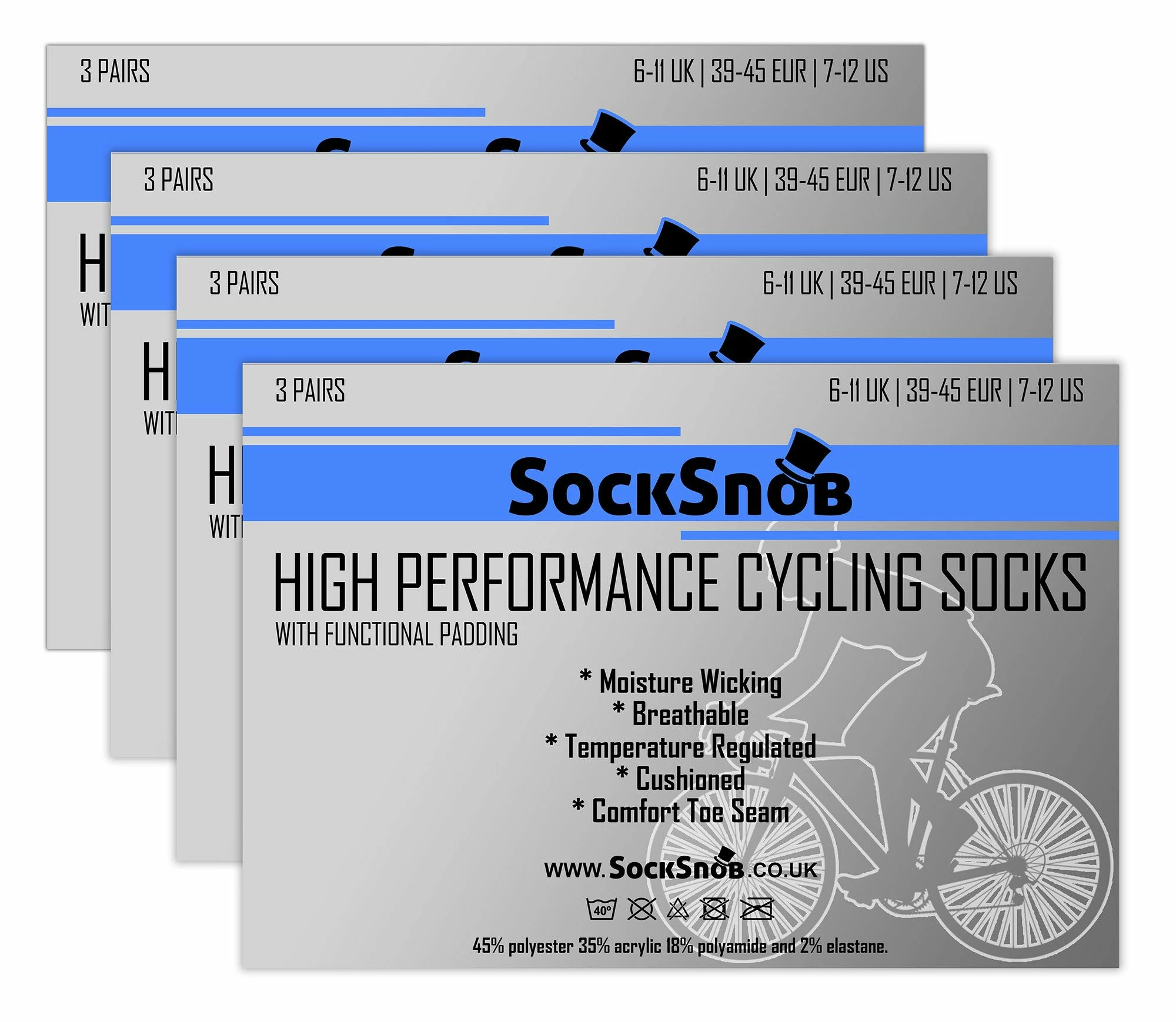 12 Pack Men’s High Performance Ankle Cycling SocksIf you are an avid cyclist and looking for a reliable pair of functional cycling socks to keep your feet comfortable and temperature regulated whilst you are cycling, then consider these men’s short cycling socks that are ideal for hot summer weather.These men’s cycling socks have many features that will help maintain your performance. Firstly, they are moisture wicking which helps keep your feet dry, breathable and temperature regulated keeping them cooler in the summer. The mesh panels knitted in the sock facilitate this. Their short length also allows for more flexibility and breathability.They are made from quick-drying materials to minimise discomfort in case your feet sweat, making them ideal to wear during hot Summers. Not only do these socks have great practical properties but they come in a 12 pair pack, making them incredible value for money!The sock is also layered with cushioned fabric to prevent blisters and keep your feet generally comfortable. The cushioned areas protect the heel toe and guard against Achilles tendon damage. They also offer a soft padding to keep your feet feeling comfortable when riding your bike. The polyester fibres are durable, prevent irritation and offer good value. The low cut length of these socks allow your feet to breathe around the ankles whilst wearing professional shoes, like trainers.These men’s cycling socks are available in a pack of 12 and come in sizes 6-11 UK, 39-45 EU, 7-12 US. They are made from 45% polyester 35% acrylic 18% polyamide and 2% elastane. They are also safely machine washable. Do not Tumble Dry.Extra Product DetailsMen’s Cycling SocksValue For MoneyLow Cut LengthAnkle Length SocksExercise SocksMoisture Wicking12 Pair PackHigh Performance SocksCushioned FabricProtected Toe and HeelMachine Washable