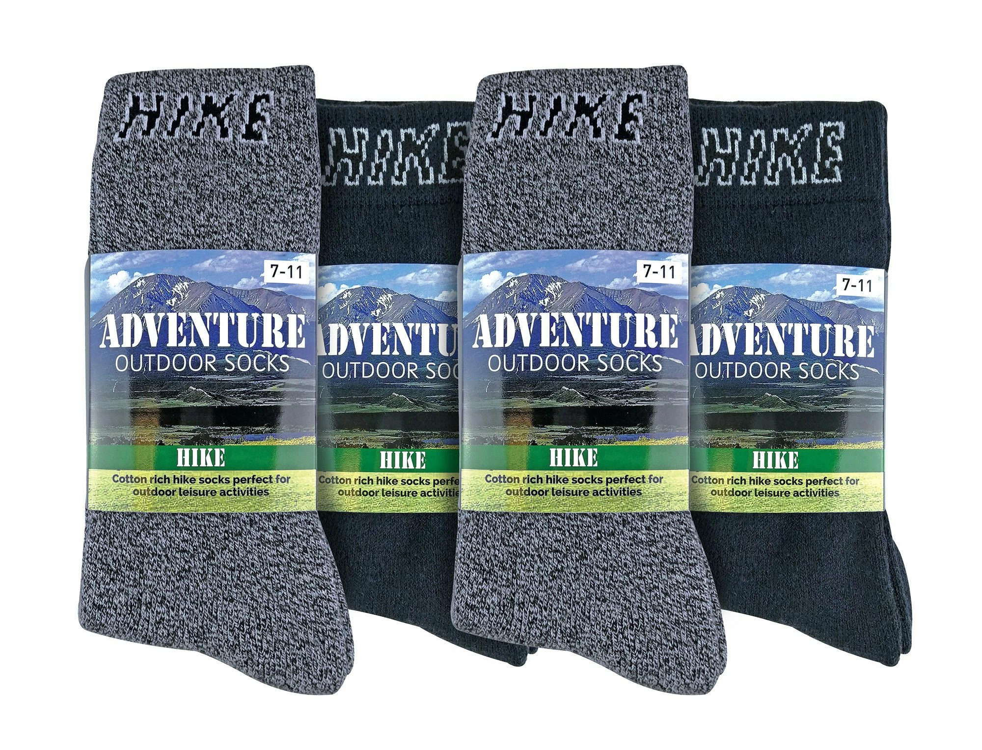 12 Pack Mens Cotton Rich HIKE SocksIf you are looking for a sock that is great for hiking, work or any other outdoor activities then these Men’s Cotton Rich HIKE Socks would be a great companion on your next trek. Not only are these made for Hiking but these are great value for money, coming in a 12 Pair Value Pack so you’ve got plenty of socks to last in the great outdoors!These socks are made from a cotton rich fabric providing ultimate comfort and durability. They also have full cushioning that protects high impact areas and reduces the chance of blisters and discomfort.These also have a comfort welt so that isn’t too tight so that it creates nasty constriction rings but it’s not too loose so that they fall down easily. The word “HIKE” is stitched at the top of the socks to pop up over the top of your boots.These socks are available in 2 Variations including Grey or Blue assortments. They are available in sizes 6-11 UK / 39-45 EU / 7-12 US and are made from 63% Cotton, 34% Polyester, 2% Nylon, 1% Elastane. They come in a Pack of 12 and are Machine Washable.Extra Product Details12 Pack Hiking SocksValue For MoneyFully CushionedComfort WeltMade For The OutdoorsComfort & DurabilityGrey or Blue Colour Assortments63% Cotton RichMen’s One Size: 6-11 UKMachine Washable