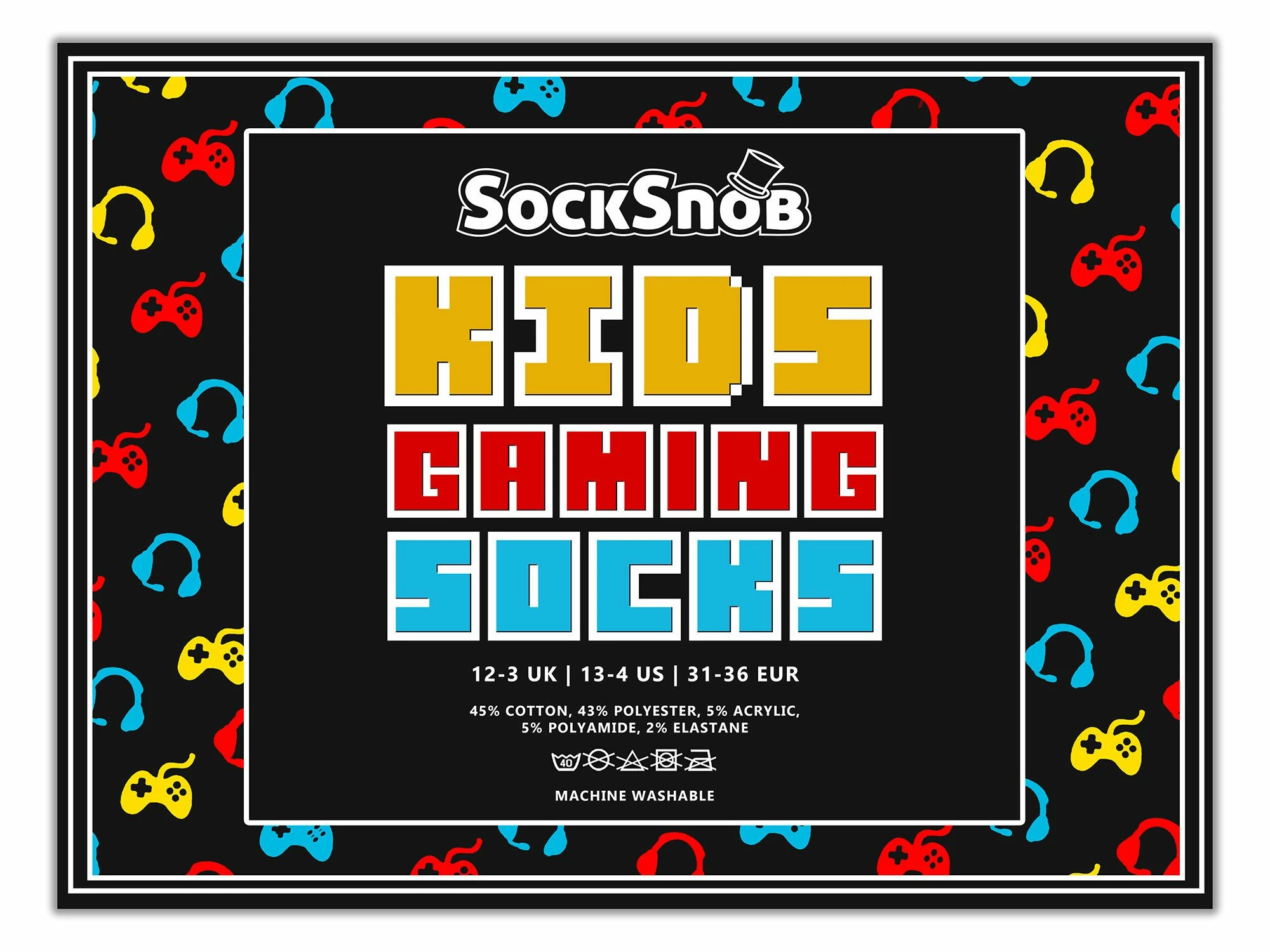 Sock Snob – Kids 3 Pack Novelty Gaming SocksAre your kids obsessed with video games? Do they spend their days playing Fortnite, Minecraft and other similar games? Then these 3 Pack Novelty Gaming Socks are the perfect pack for them!These socks are made from cotton rich fibres that are soft and comfortable. They are ideal for video game lovers, and will keep their feet warm and dry throughout long gaming sessions.The socks feature cool looking Game Controller & Headset patterns as well as a couple of great slogans saying “GAMER” and “LET’S PLAY”. There’s also 3 bright and funky colours per pack – Red, Blue & Yellow so they’ll stand out from the crowd. Plenty of choice for any little gamer!These socks would even make a great gift idea for a Birthday, Christmas or even a stocking filler. Perfect for any video game fanatic!Whether they’re sitting in playing on their favourite console or deciding to pause the game and venture out into the wide world, these socks are sure to turn heads with their funky designs and bright colours.They come in a 3 pair pack, are made from 45% Cotton, 43% Polyester, 5% Acrylic, 5% Polyamide, 2% Elastane and come in 2 Kids sizes: 9-12 UK (27-30 EUR, 10-1 US) & 12-3 UK (30-36 EUR, 13-4 US). They are safely Machine Washable.Extra Product DetailsKids Gaming Socks3 Pairs Per PackCotton Rich FibresSuper Soft & ComfortableA Great Gift IdeaIdeal For Video Game LoversGame Controller & Headset Patterns3 Colours Per Pack: Red, Blue & Yellow2 Kids Sizes: 12-3 & 9-12 UKMachine Washable