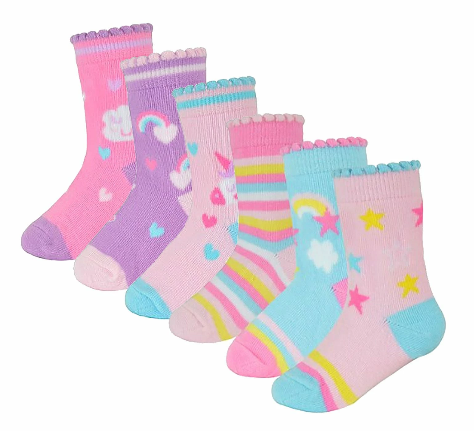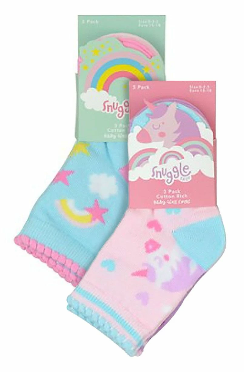 Baby Girls 6 Pack Unicorn Design SocksIf you need to stock up on the little ones’ sock drawer but want to make sure that you’ve got socks to last them as well being soft and comfy for their tiny feet then why not consider these great 6 Pack Cotton Rich Unicorn Socks?Designed with you little girl in mind, these socks come with cute and pretty patterns of the popular mythical creature, Unicorns on them! With great pinks, purples, stars and rainbow patterns, as well as a couple of striped socks included, there’s plenty for you to choose from in one pack.These baby girl socks are Cotton Rich which will make sure that their feet remain super soft and comfortable throughout the day.These socks come in 6 pairs with Unicorns, Stars, Rainbows and more on them and are available in 3 sizes: 0-6 Months, 6-12 Months & 12-24 Months. They are made from 78% Cotton; 20% Polyester; 2% Elastane and are Machine Washable.Extra Product Details6 Pack Baby Unicorn SocksCotton Rich MaterialUnicorn, Star & Rainbow PatternsSoft & ComfortablePerfect For Your Little GirlBright & Funky ColoursPlenty Of Styles To Choose From78% Cotton; 20% Polyester; 2% Elastane3 Size OptionsMachine Washable
