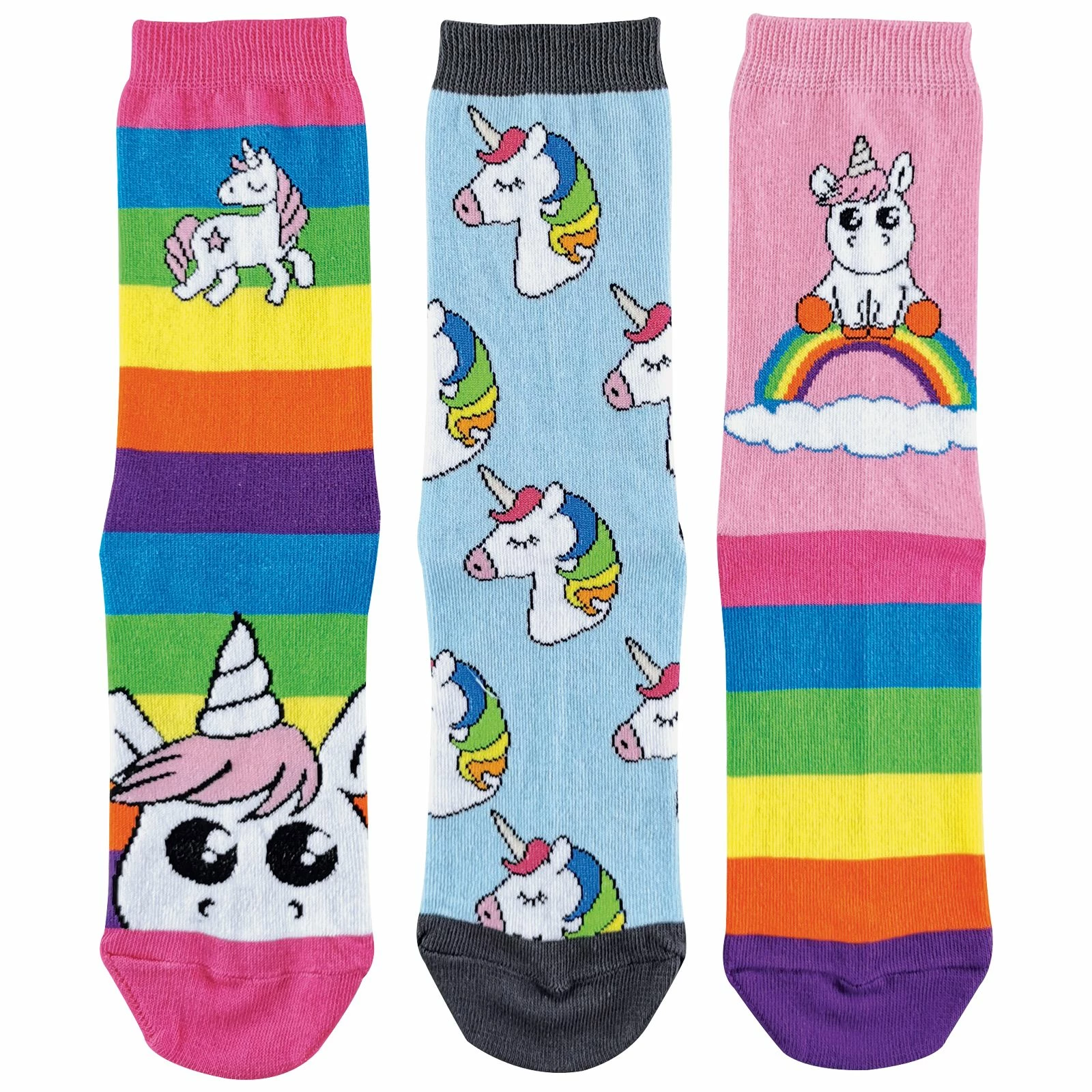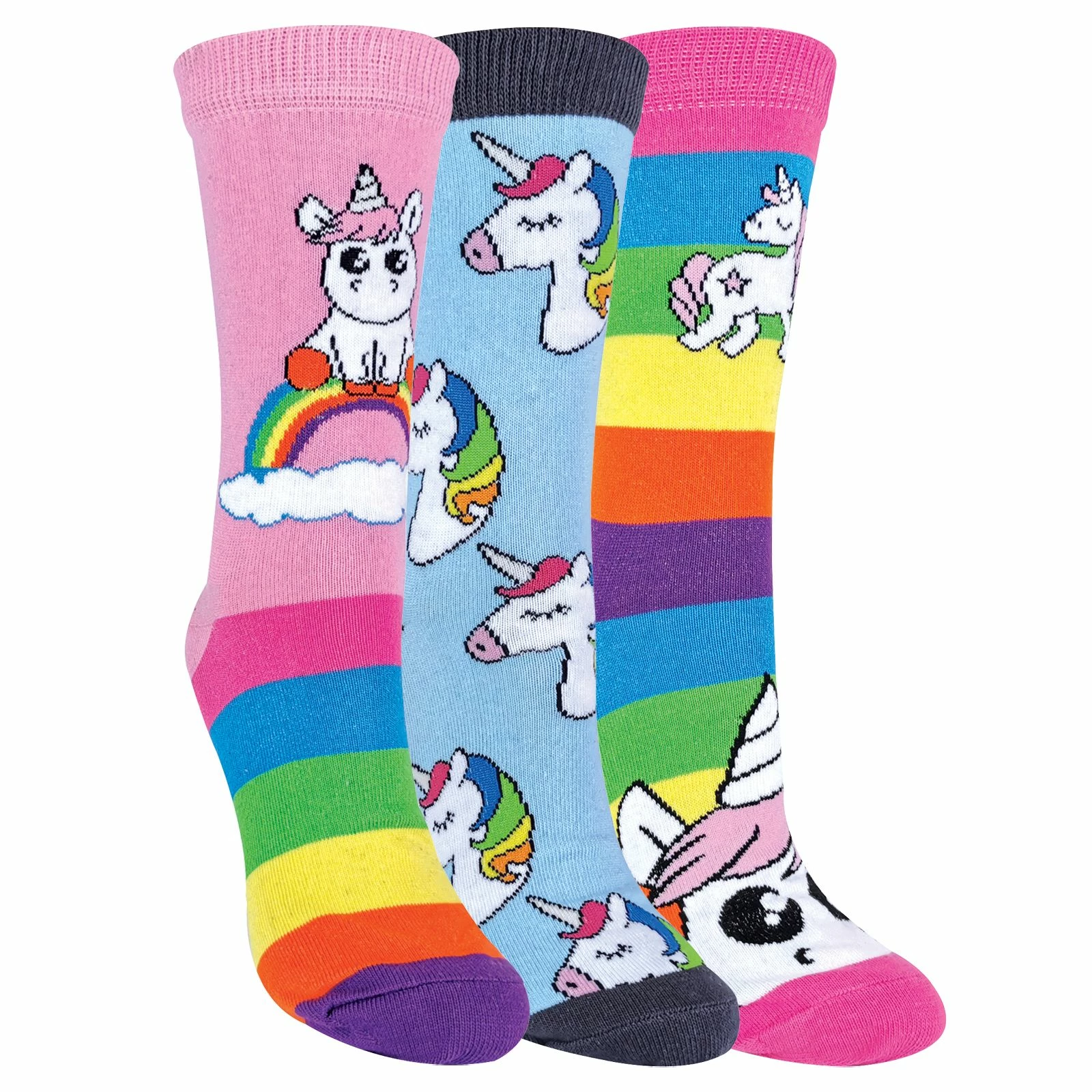 Ladies 3 Pack Unicorn Rainbow SocksUnicorns! The legendary creature of myth and extremely popular animal that is loved by people everywhere. So what better way to show their Unicorn love than to have them on a pair of everyday socks? With a bunch of funky colours and styles these are essential for anyone out there looking to show off Unicorn fandom. Maybe you have a woman in your life that would love these? Well that’s great because they’d make a perfect gift!They’re made from a soft and comfortable Cotton so that they don’t have to sacrifice function for fashion. Not only do they have Unicorn images on them but some of the socks in the 3 pack have classic rainbow striped designs on them which give them plenty of choice when choosing an outfit for the day.These socks are a regular ankle length, come in a 3 pack and have bright mixed colours like Pink, Purple, Blue and more. They’re made out of 74% Cotton, 24% Polyester, 2% Elastane, come in size 4-7 UK and are safely machine washable.Extra Product DetailsLadies Unicorn Rainbow SocksCotton RichSoft & Comfortable3 Pair PackPerfect For EverydayBright & ColourfulGreat Gift IdeaMachine Washable