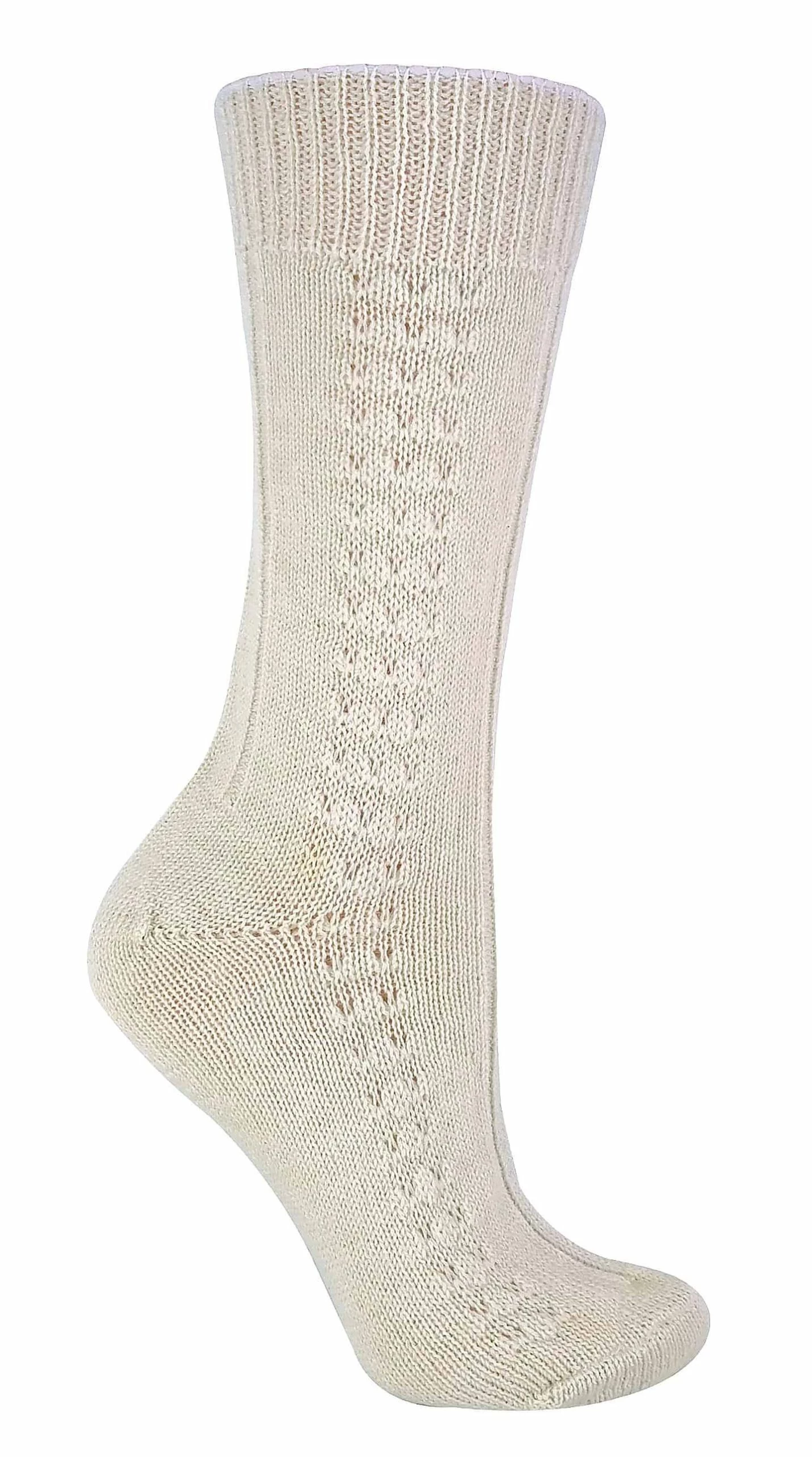 Ladies 100% Wool Bed Socks Socks that are made from 100% wool and that are fully functional can be hard to find. These ladies 100% wool bed socks are as warm and cuddly as they look. Wool is traditionally known to be one of the best insulating fibres around, trapping warm air and holding it close to your skin. With a 100% wool material composition, these socks have the ultimate ability to keep your feet warm. The top of the sock also has a loose fit – facilitating blood circulation, great if you are relaxing around the house or in bed for a less constrictive feel. These ladies socks also have a ribbed Nordic-like pattern that rides up the sock from the toe to the welt. This pair of ladies 100% wool bed socks are available in the colour natural and are a size 4-7 UK 37-42 eur. They come in a 1 pair pack and are machine washable. Extra Product Details – 1 Pair Pack – Size 4-7 UK 37-42 – Ladies socks – 100% Wool – Perfect for relaxing – Non-constricting top – Nordic-like knitting pattern – Machine Washable