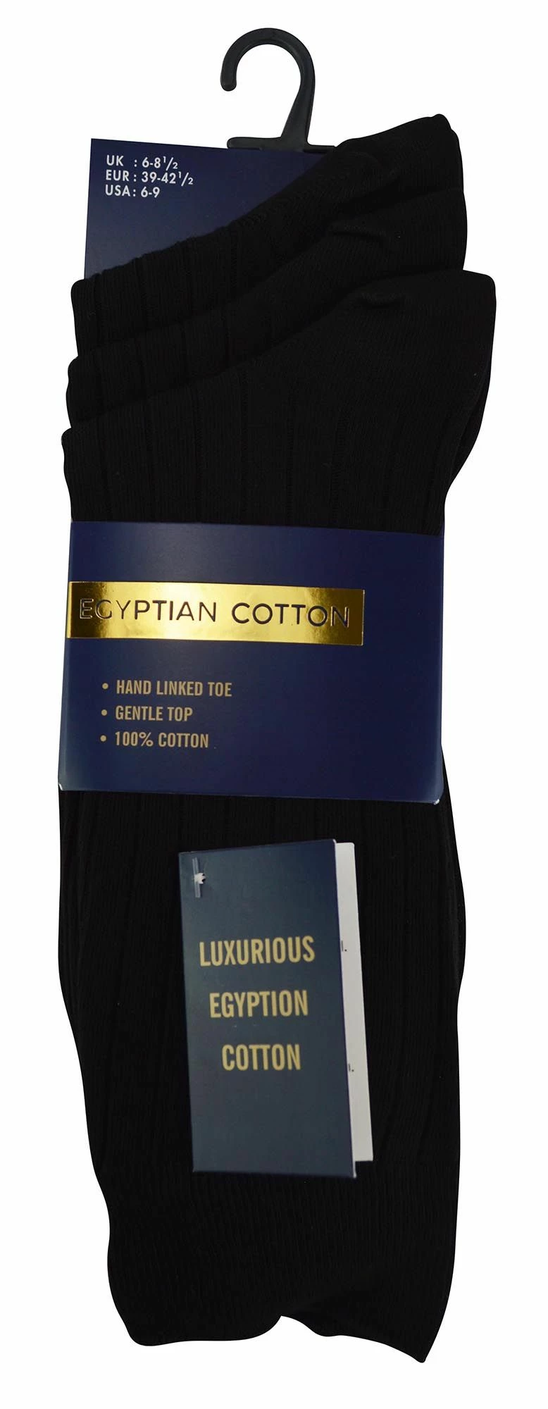 6 Pack 100% Egyptian Cotton SocksEgyptian Cotton is World famous for being possibly the softest cotton out there, so you know that these 100% Egyptian Cotton Socks are going to be super soft and super comfy!These luxury socks are made with a hand linked toe seam which means more comfort and next to no irritation around your toes. They also include a gentle soft top so that they not only stay up all day but you won’t have to deal with those nasty constriction rings anymore!With them being made on 100% High Quality Egyptian Cotton it makes them super soft and comfy as well as being smooth against the skin for even less irritation. It also includes no pilling which gives a smoother material and with this quality it means that the sock will last much longer than the average cotton sock.Egyptian Cotton is grown along the banks of the Nile where the soil is rich in nutrients and the climate is humid. It’s processed by hand, helping to keep the fibres as soft and natural as possible.These socks are available in Black and come in 3 sizes: 6-8 UK, 9-12 UK, 12-14 UK. They are 100% Egyptian Cotton and machine washable at 40.Extra Product Details6 Pairs Cotton Socks100% Egyptian CottonSuper Soft & ComfyHand Linked Toe SeamSoft Gentle TopLong LastingMuch Softer Than Normal CottonNo Pilling or IrritationAvailable in Black3 Size OPtionsMachine Washable