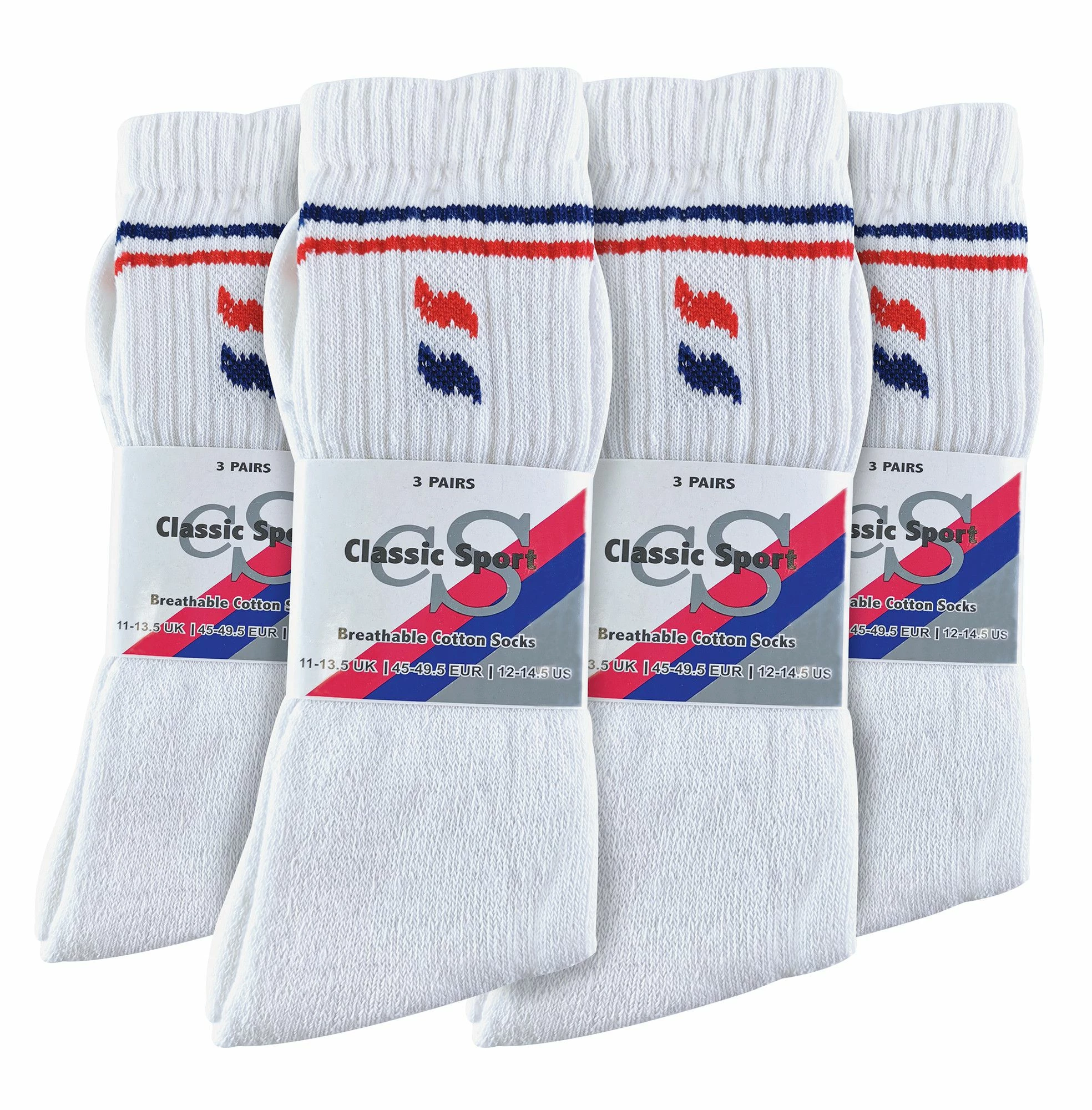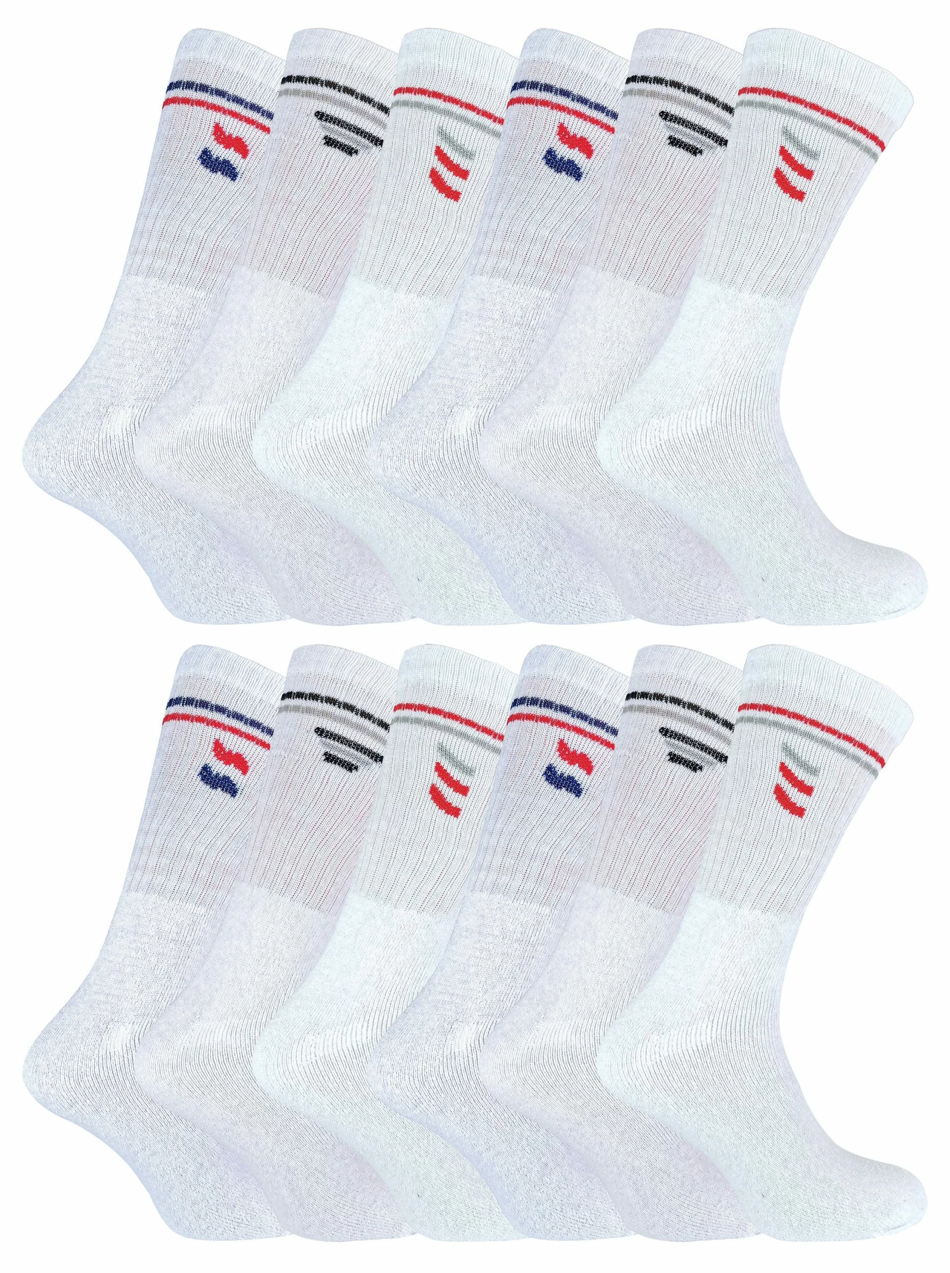 12 Pairs Mens Retro Cotton Sport SocksWhether for playing sports or regular everyday socks these classic sport socks will guarantee to keep feet comfortable and supported. So why not pick up this great value pack of Cotton Sport Socks that give you 12 Pairs per set?These socks are cotton rich meaning they will surround your feet in natural softness so that you will be comfortable throughout the day. Having a high cotton content these socks will control temperature making sure that your feet stay cool whether during activity or during the summer time.These socks have the classic sporty look to them with a cushioned sole for the foot and a secure ribbed leg. The cushioning in the sole makes sure that your feet are supported with a soft padding at all times while you run around playing sports. The ribbed leg will keep the socks in place while you’re running around.These socks are available in 2 sizes: 6-11 UK & 12-14 UK. They are available in Black & White and made from: 47% Cotton, 44% Polyester, 9% Viscose. They are safely Machine Washable.Extra Product DetailsCotton Sport Socks12 Pairs Per PackSoft & ComfortableMade For SportsCushioned SoleRIbbed LegKeeps Feet CoolValue For MoneyAvailable In Black & WhiteMachine Washable
