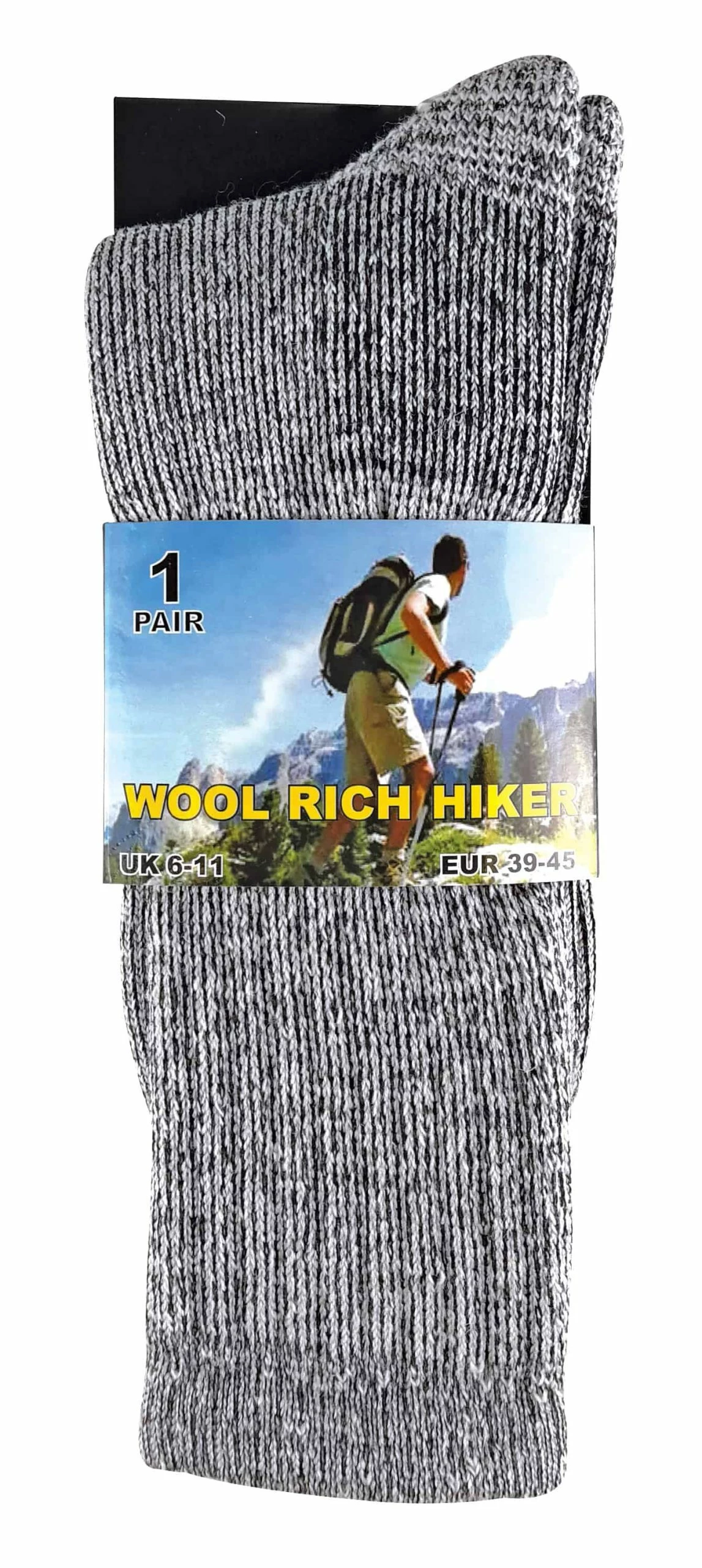 Mens Wool Rich Hiking Socks Enjoy the great outdoors in warmth, comfort and even style with our very own ladies wool hiking socks. Irritable feet can ruin any hiking experience whether you have blisters or cold feet, but with these wool rich hiking socks you will experience no such thing. Firstly, these socks have a reinforce heel and toe and also a terry cushion lining giving your feet extra protection when you step onto rough terrain. A fine toe seam also adds to the superior all day comfort qualities these socks will give your feet. Antimicrobial technologies are also incorporated into the sock, preventing sweaty feet so reducing the chances of developing blisters and odour-causing bacteria appearing on your feet. Also, these socks have a 60% wool content to keep your feet warm throughout the day, certainly ideal for wintery conditions. Our mens wool hiking socks are a size 6-11 UK with 4 modern colours to choose between including baby pink, sky blue, light brown and lilac. Extra Product Details * Wool socks for the great outdoors * 4 different colours to choose between * Reinforced heel and toe construction for extra durability * Fine toe seam to reduce irritation * Terry cushion lining for comfort and protection * True heel and toe for extra comfort * Antimicrobial protection prevents the growth of odour-causing bacteria * Wool is knit into a deep terry pile to provide extra warmth * Secure stay up rib * Size4-8 UK * 60% Wool 38% Polyamid 2% Lycra Elastane