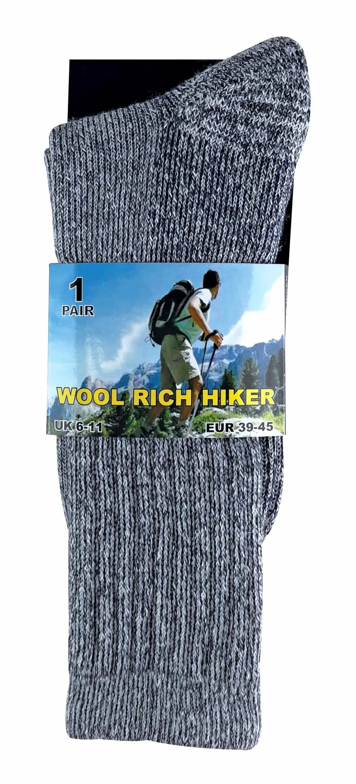 Mens Wool Rich Hiking Socks Enjoy the great outdoors in warmth, comfort and even style with our very own ladies wool hiking socks. Irritable feet can ruin any hiking experience whether you have blisters or cold feet, but with these wool rich hiking socks you will experience no such thing. Firstly, these socks have a reinforce heel and toe and also a terry cushion lining giving your feet extra protection when you step onto rough terrain. A fine toe seam also adds to the superior all day comfort qualities these socks will give your feet. Antimicrobial technologies are also incorporated into the sock, preventing sweaty feet so reducing the chances of developing blisters and odour-causing bacteria appearing on your feet. Also, these socks have a 60% wool content to keep your feet warm throughout the day, certainly ideal for wintery conditions. Our mens wool hiking socks are a size 6-11 UK with 4 modern colours to choose between including baby pink, sky blue, light brown and lilac. Extra Product Details * Wool socks for the great outdoors * 4 different colours to choose between * Reinforced heel and toe construction for extra durability * Fine toe seam to reduce irritation * Terry cushion lining for comfort and protection * True heel and toe for extra comfort * Antimicrobial protection prevents the growth of odour-causing bacteria * Wool is knit into a deep terry pile to provide extra warmth * Secure stay up rib * Size4-8 UK * 60% Wool 38% Polyamid 2% Lycra Elastane