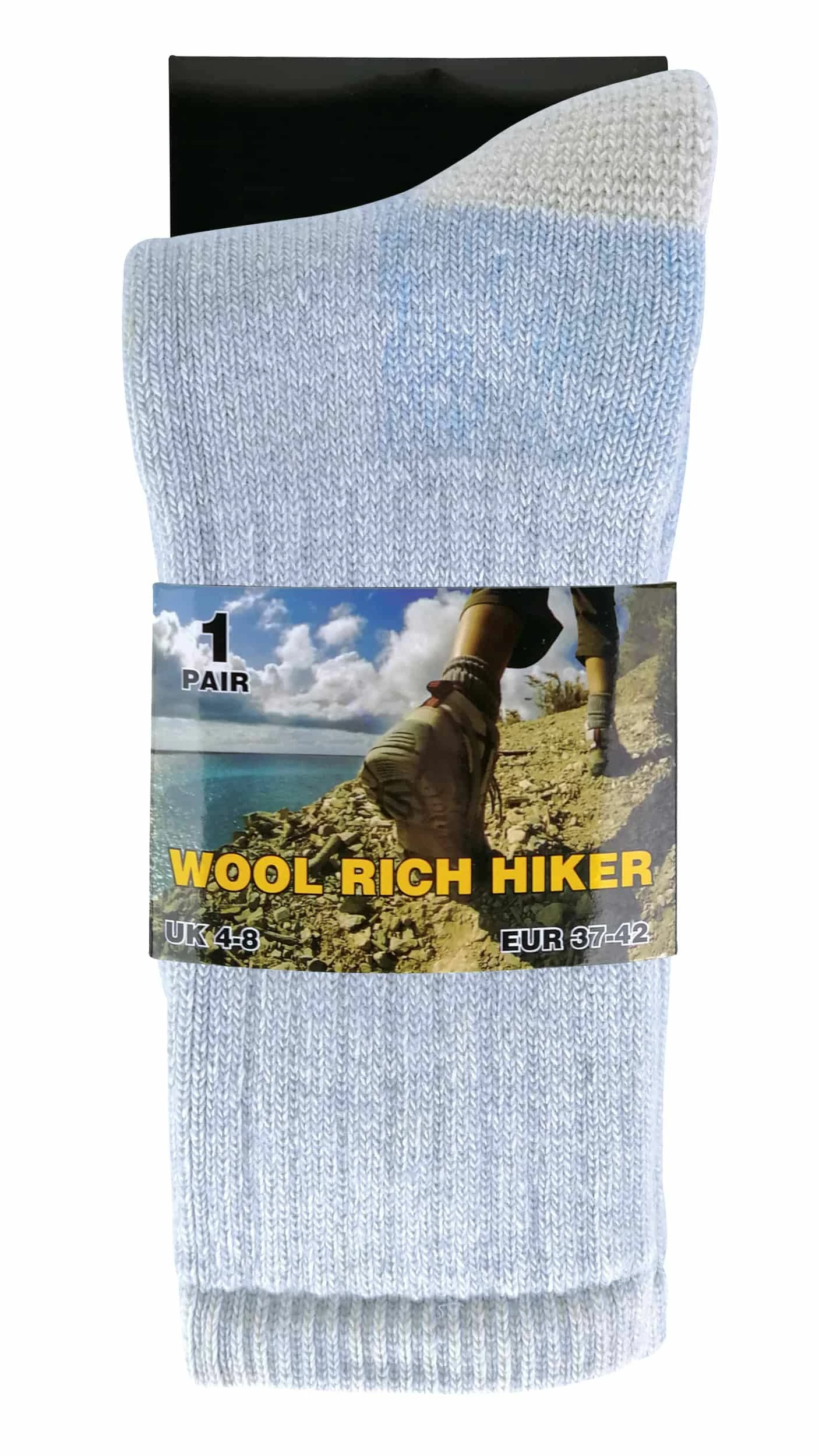 Ladies Wool Rich Hiking Socks Enjoy the great outdoors in warmth, comfort and even style with our very own ladies wool hiking socks. Irritable feet can ruin any hiking experience whether you have blisters or cold feet, but with these wool rich hiking socks you will experience no such thing. Firstly, these socks have a reinforce heel and toe and also a terry cushion lining giving your feet extra protection when you step onto rough terrain. A fine toe seam also adds to the superior all day comfort qualities these socks will give your feet. Antimicrobial technologies are also incorporated into the sock, preventing sweaty feet so reducing the chances of developing blisters and odour-causing bacteria appearing on your feet. Also, these socks have a 60% wool content to keep your feet warm throughout the day, certainly ideal for wintery conditions. Our ladies wool hiking socks are a size 4-8 UK with 4 modern colours to choose between including baby pink, sky blue, light brown and lilac. Extra Product Details * Wool socks for the great outdoors * 4 different colours to choose between * Reinforced heel and toe construction for extra durability * Fine toe seam to reduce irritation * Terry cushion lining for comfort and protection * True heel and toe for extra comfort * Antimicrobial protection prevents the growth of odour-causing bacteria * Wool is knit into a deep terry pile to provide extra warmth * Secure stay up rib * Size 4-8 UK 37-42 EUR 5-9 US * 60% Wool 38% Polyamid 2% Lycra Elastane