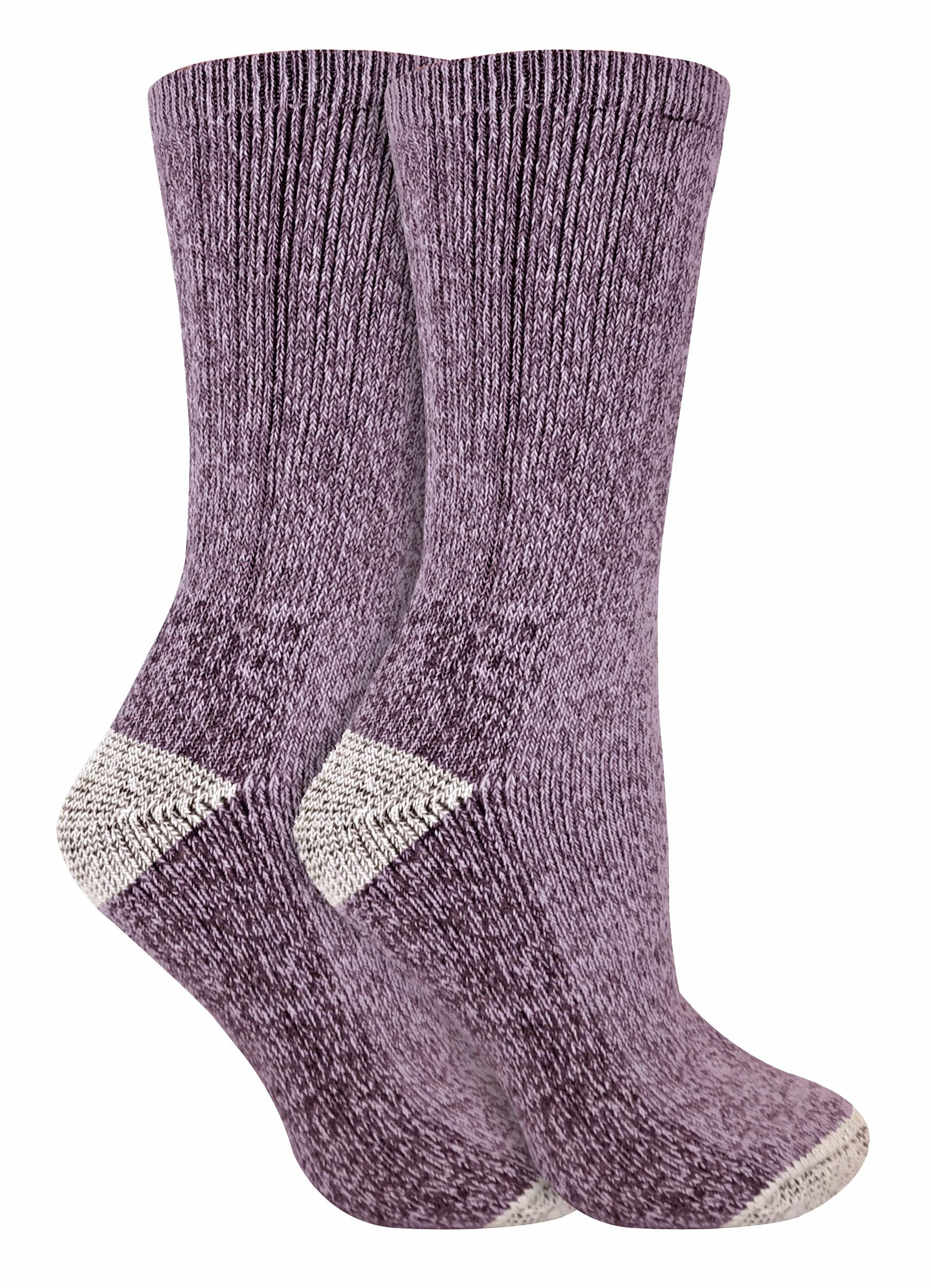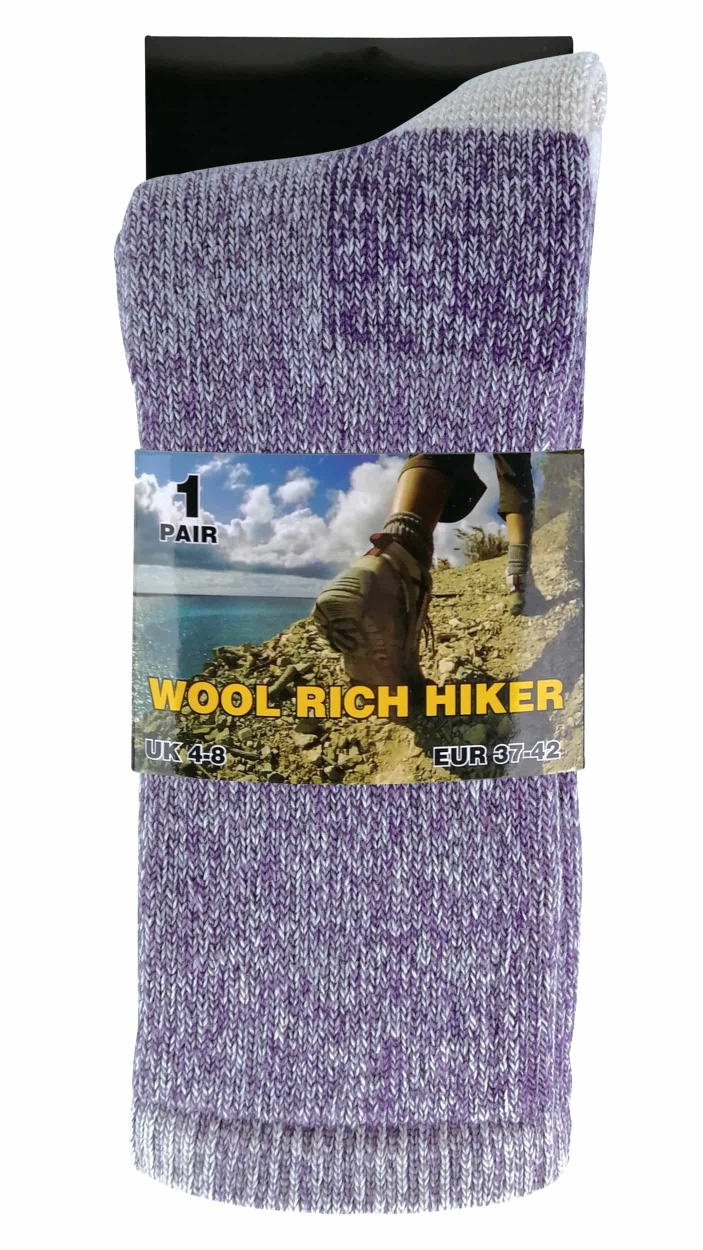 Ladies Wool Rich Hiking Socks Enjoy the great outdoors in warmth, comfort and even style with our very own ladies wool hiking socks. Irritable feet can ruin any hiking experience whether you have blisters or cold feet, but with these wool rich hiking socks you will experience no such thing. Firstly, these socks have a reinforce heel and toe and also a terry cushion lining giving your feet extra protection when you step onto rough terrain. A fine toe seam also adds to the superior all day comfort qualities these socks will give your feet. Antimicrobial technologies are also incorporated into the sock, preventing sweaty feet so reducing the chances of developing blisters and odour-causing bacteria appearing on your feet. Also, these socks have a 60% wool content to keep your feet warm throughout the day, certainly ideal for wintery conditions. Our ladies wool hiking socks are a size 4-8 UK with 4 modern colours to choose between including baby pink, sky blue, light brown and lilac. Extra Product Details * Wool socks for the great outdoors * 4 different colours to choose between * Reinforced heel and toe construction for extra durability * Fine toe seam to reduce irritation * Terry cushion lining for comfort and protection * True heel and toe for extra comfort * Antimicrobial protection prevents the growth of odour-causing bacteria * Wool is knit into a deep terry pile to provide extra warmth * Secure stay up rib * Size 4-8 UK 37-42 EUR 5-9 US * 60% Wool 38% Polyamid 2% Lycra Elastane
