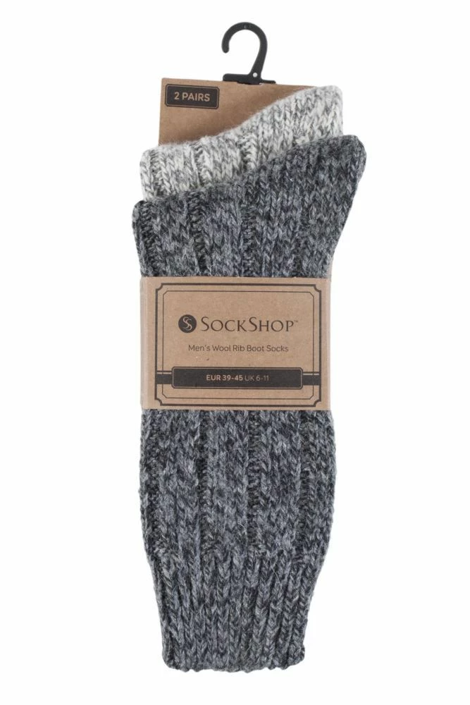 SockShop Wool Ribbed Boot Socks These wool boot socks are as warm as they look. Wool is traditionally known to be one of the best insulating fibres around, trapping warm air and holding it close to your skin. With a chunky knit look and ability to keep your feet warm, they are perfect for casual and hiking wear. These socks have a ribbed leg to help keep the socks secure on your leg. These boot socks are made of a wool mix to get the warmth wool provides. Being thick and chunky, these socks have many different ways to be worn. Their knit style makes them fashionable and great for wearing with everyday boots, or their comfort and warmth makes them ideal for light hikes. These socks come in a pack of 2 pairs and are available in 2 shades of grey; the men’s being darker shades, while the women’s coming in lighter shades. They are available in sizes 4-8 UK / 37-42 EU / 5-9 US or 6-11 UK / 7-12 US / 39-45 EU. They are made from 38% Polyester, 35% Wool, 17% Acrylic, 5% Nylon, 3% Viscose, 1% Cotton, 1% Elastane. They are Machine Washable. Extra Product Details – SockShop – 2 Sizes – 2 Pairs – Ribbed Leg – Chunky Knit – Wool Mix – 38% Polyester, 35% Wool, 17% Acrylic, 5% Nylon, 3% Viscose, 1% Cotton, 1% Elastane – Machine Washable