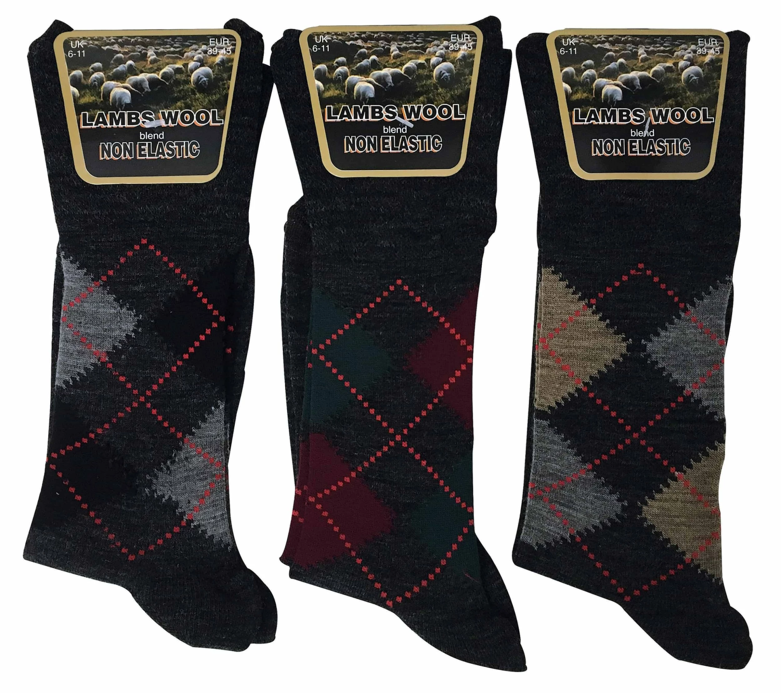 Mens Non-Elastic Lamb’s Wool Socks A traditional argyle wool sock has always been considered as one of the essentials for any man’s sock drawer, especially if he is enjoying the great outdoors regularly. If your looking for a warm non-elastic sock then these socks would be great for you. This 3 pack offers a soft touch on the foot, protection in rough terrains and warmth to trap the natural body heat that is created by your feet. A non-elastic honeycomb knit at the top of the socks provides a loose top that will not constrict your legs and is great for circulation. They also are made of a lamb’s wool blend that provides a soft cushion around the foot. The lamb’s wool blend incorporated into the manufacturing of these socks gives them the thermal ability to keep your feet warm in cold temperatures for long periods of time, meaning you can enjoy the great outdoors in comfort and warmth for longer. The traditional argyle patterns available come in 2 options, a brown mix and a grey mix. One size is available in a 6-11 UK 39-45 eur 7-12 US and they are easily machine washable. Extra Product Details * Lamb’s wool blend non-elastic socks * 2 colours to choose between * Size 6-11 UK 39-45 eur 7-12 US * Advanced knitting technologies * Keep feet warmer for longer * Traditional argyle patterns * Non-elastic top to help promote blood circulation * 55% Acrylic 25% Wool 18% Polyester 2% Elastane Lycra * Machine washable