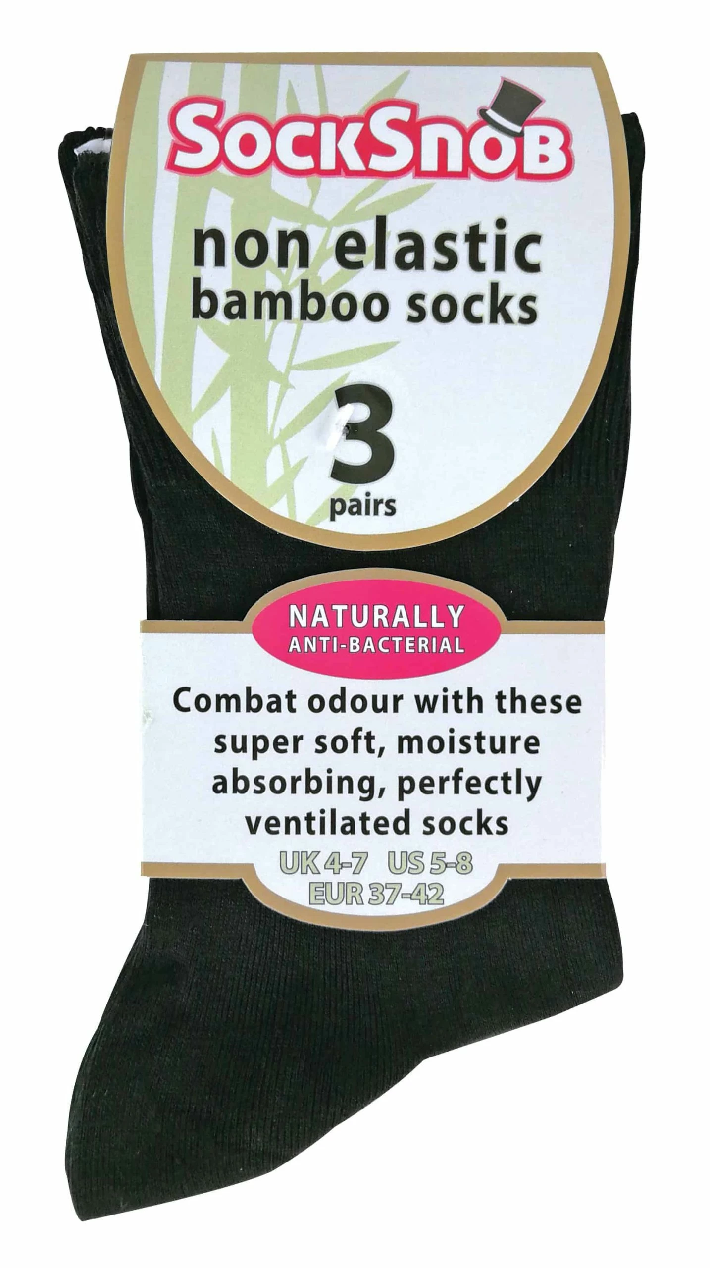 Ladies Non Elastic Viscose Bamboo Socks If you are looking for a pair of socks that are loose around your legs and are super soft then these non-elastic viscose bamboo socks are the perfect pair of socks for your legs. Firstly, these socks are very soft with their 72% viscose bamboo content. Bamboo is a desirable material with many notable qualities. Bamboo is naturally antibacterial and odour resistant, meaning your feet will be dry throughout the day and will not give off an unpleasant odour. Bamboo also regulates the temperature, keeping your feet cool in the summer and warm in the winter. These socks are also knitted on a fine needle gauge, making them thinner and soft than ordinary dress socks, a perfect asset if you are looking for a soft breathable sock. These socks also have non elastic tops meaning that they are non-constrictive and will not make marks around your legs. These socks come in a 3 pair pack and are available in 4 colours. They are a size 4-7 UK 37-42 eur 5-8 US and are 72% Viscose Bamboo 28% Polyamide. They are also safely machine washable. Extra Product Details * Ladies viscose bamboo socks * 3 pair pack * Non elastic * Extra Thin * 4 colours to choose between * 4-7 UK 37-42 eur 5-8 US * 72% Viscose Bamboo 28% Polyamide * Machine washable