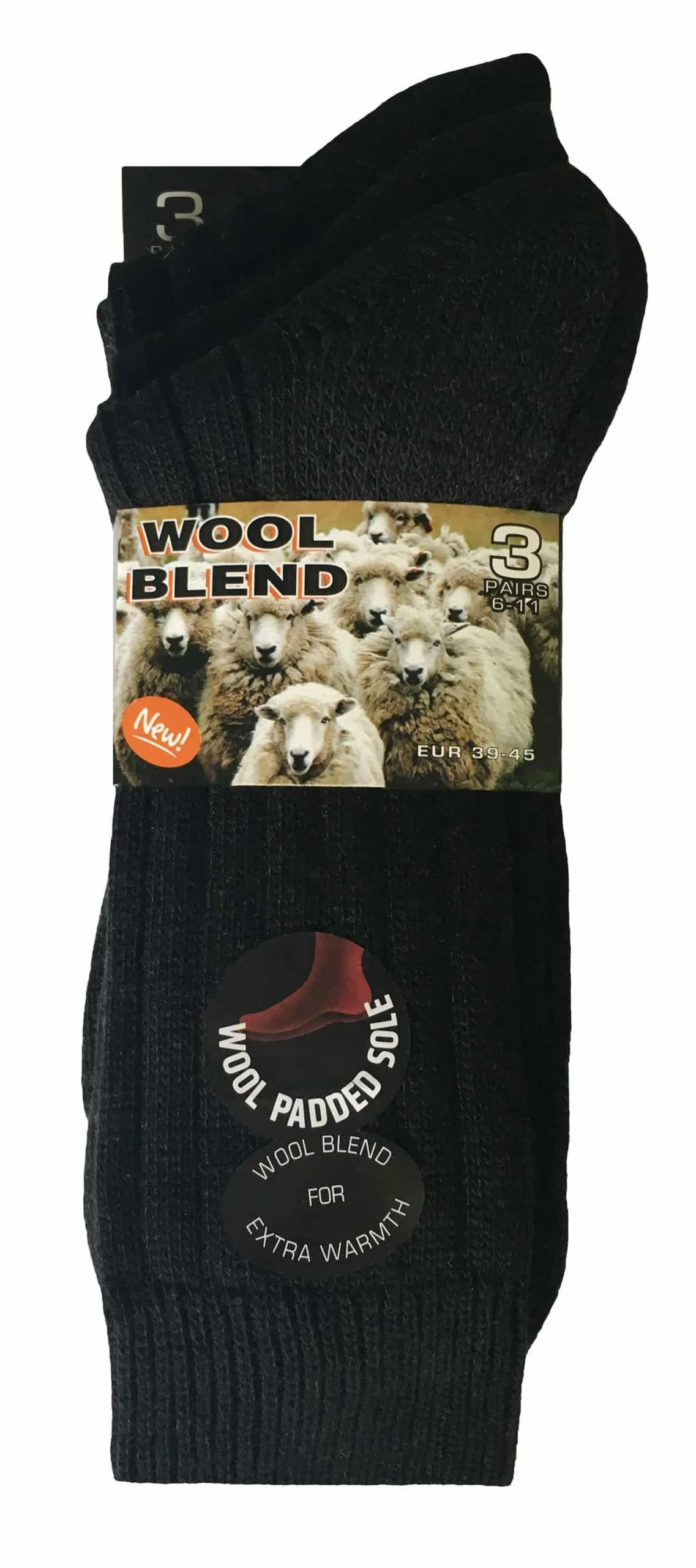 Mens Wool Padded Sole Socks When your in the great outdoors it is essential to keep warm and comfortable. These wool blend socks are designed especially for that purpose. Coming in a 3 pair pack, these wool socks are guaranteed to keep your feet extra warm. They are designed to trap the heat that comes from your natural body heat. Extra features include a terry cushion extra padded sole for extra comfort and support, this becomes very helpful when walking on rough terrain. These socks also have a unique stay up top to ensure that they don’t fall down easily. Unlike most wool socks, these socks are designed to let your feet breath. These wool blend socks are available in 4 different colour ways including brown, blue, black and grey. They are a size 6-11 UK 39-45 eur. Extra Product Details * 4 colours to choose between * 3 pair pack * Terry cushion * Extra padded sole * Size 6-11 UK 39-45 eur. * Designed to trap the heat * 35% Acrylic 35% Polyester 20% Wool 10% Mixed Fibres * Keep your feet warm and comfortable * Designed to let your feet breath