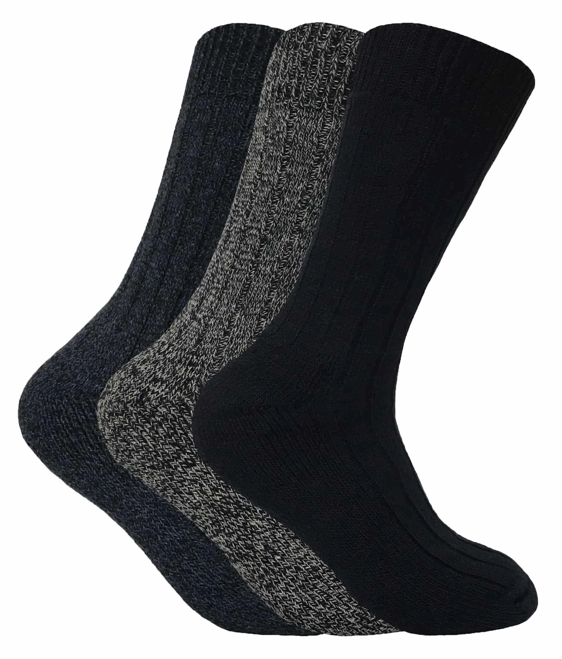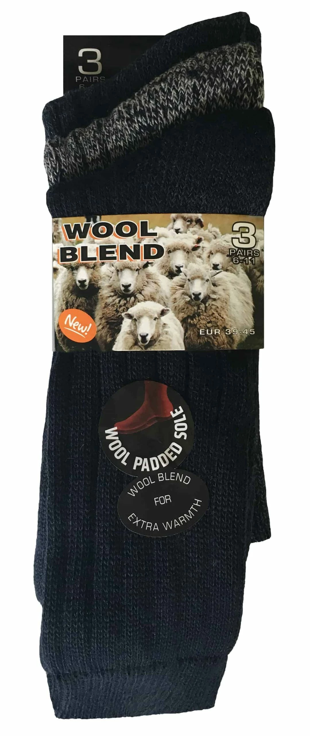 Mens Wool Padded Sole Socks When your in the great outdoors it is essential to keep warm and comfortable. These wool blend socks are designed especially for that purpose. Coming in a 3 pair pack, these wool socks are guaranteed to keep your feet extra warm. They are designed to trap the heat that comes from your natural body heat. Extra features include a terry cushion extra padded sole for extra comfort and support, this becomes very helpful when walking on rough terrain. These socks also have a unique stay up top to ensure that they don’t fall down easily. Unlike most wool socks, these socks are designed to let your feet breath. These wool blend socks are available in 4 different colour ways including brown, blue, black and grey. They are a size 6-11 UK 39-45 eur. Extra Product Details * 4 colours to choose between * 3 pair pack * Terry cushion * Extra padded sole * Size 6-11 UK 39-45 eur. * Designed to trap the heat * 35% Acrylic 35% Polyester 20% Wool 10% Mixed Fibres * Keep your feet warm and comfortable * Designed to let your feet breath