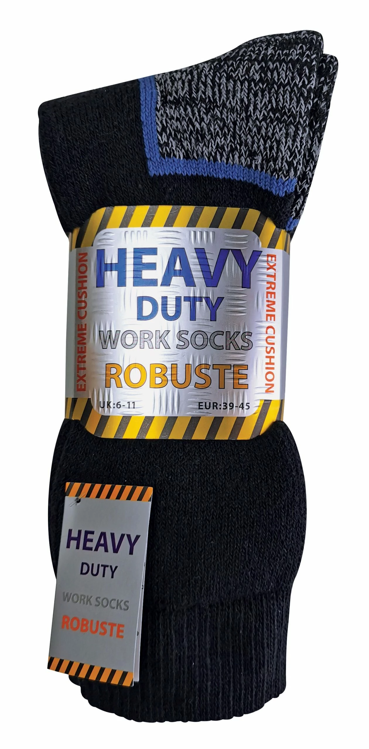 3 Pack Heavy Duty Work SocksTo maintain a high standard of work requires you having the best tools for the job. The same applies for your feet. That’s why we have developed a range of extra sturdy Work Socks that will withstand the pressures of a tough demanding day. These Heavy Duty Function Work Socks will not only provide wearing comfort they will also extend durability to help meet the demands of your feet. Additionally they come with Terry Cushioning throughout for added comfort and to absorb sweat.The heel and toe are reinforced for ultimate durability, strength and to prevent movement in the shoe. The socks also include an Arch Brace which will give you extra support and a snug fit.The top of the sock has an extra stretch welt which gives added comfort and makes it easy to get on and off your foot. It also will help to not be too constricting around your leg.These Robust Work Socks are available in one size – Men’s 6-11 UK, come in 3 colours per pack and are made from 55% Cotton, 40% Polyester, 4% Polyamide and 1% Elastane. They are also safely machine washable.Extra Product DetailsMens Heavy Duty Work SocksRobust and ToughIdeal for Industrial WorkTerry CushioningReinforced Heel & ToeExtra Stretch WeltArch BraceDurable and ComfySize 6-11 UKMachine Washable