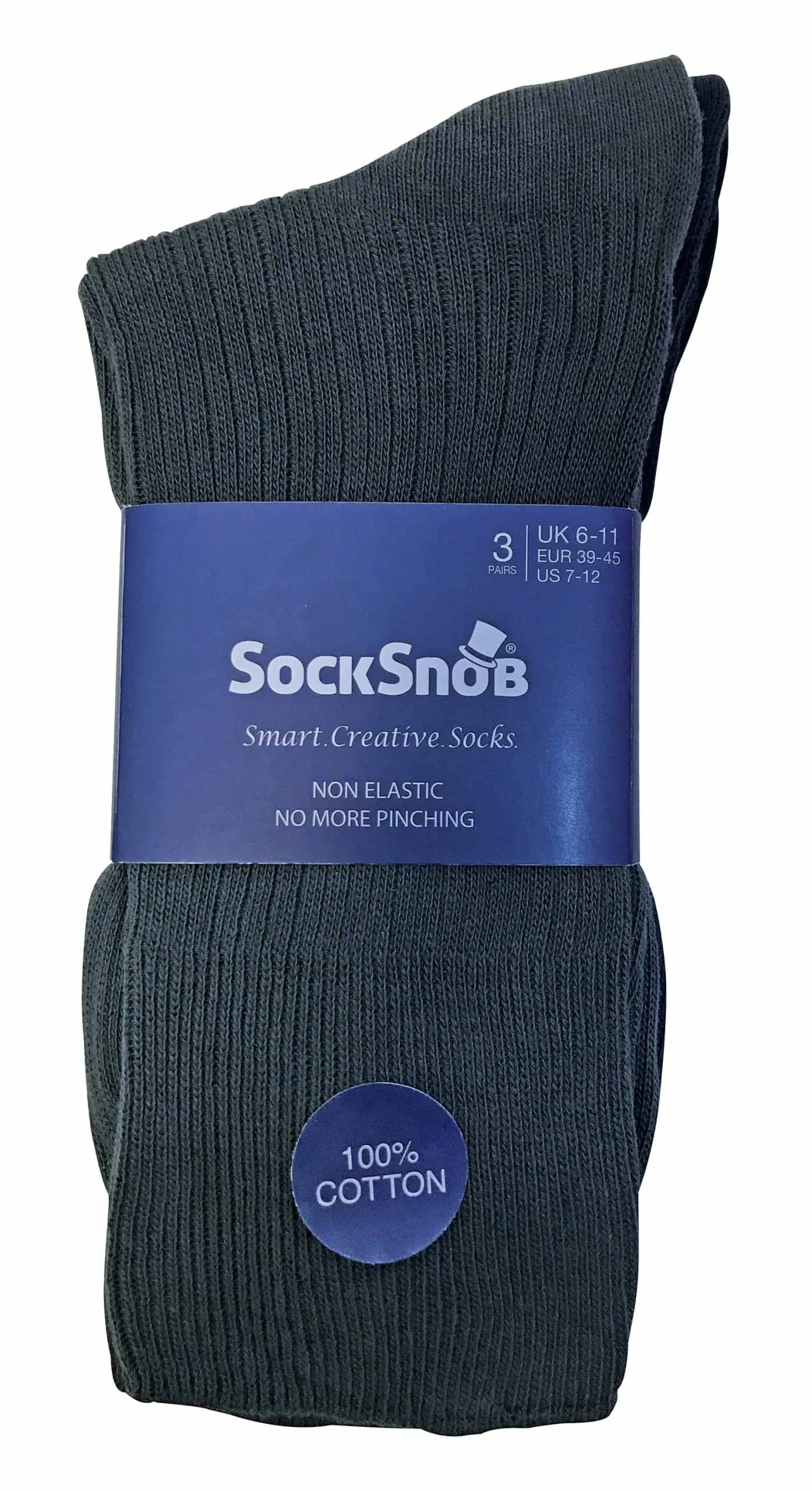 100% Cotton Non Elastic Socks 100% cotton socks are an essential item if you are looking for the ultimate comfort that cotton has to offer. These socks are also non elastic / non-binding giving you extra comfort throughout the day. 100% cotton socks are perfect if you are looking for lightweight socks that are super comfortable. These socks are also breathable and fantastic for the summer months. Where these socks are different from ordinary 100% cotton socks is that they are non-elastic. They are perfect for people who suffer from poor circulation and are suitable for anyone with swollen feet or legs. These socks stretch to the natural contours of your feet, meaning no more nasty constriction rings. However they are not too loose so that they will fall down. These 100% cotton non elastic socks are sold in a 6 pair pack and there are 3 colours available. They are a size 6-11 UK or 11-14 uk and they are made from 100% organic cotton. They are safely machine washable. Extra Product Details – 6 pair pack – 100% cotton – Non elastic – 3 colours available – 6-11 UK / 11-14 uk – Machine washable