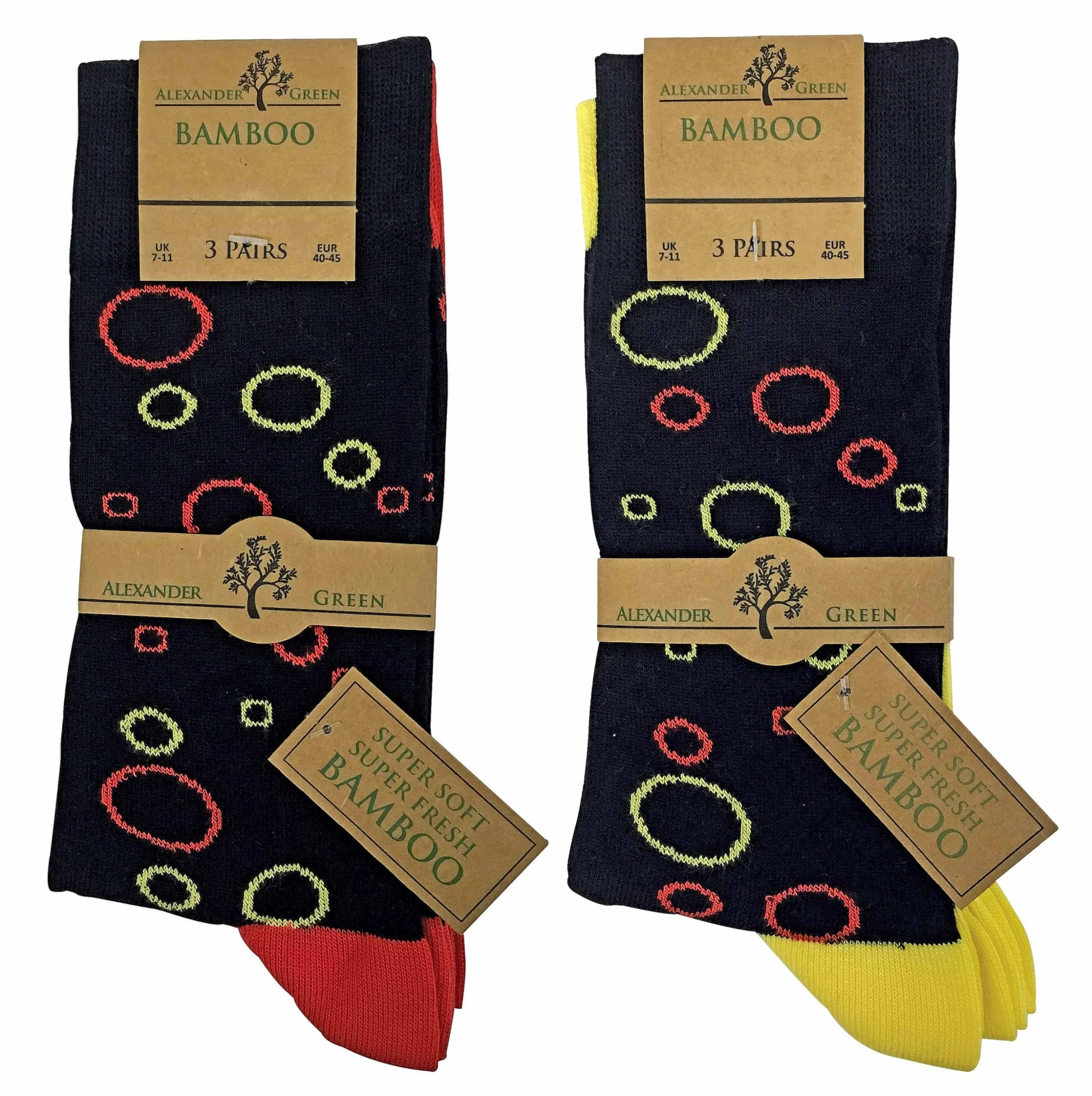 6 Pairs of Mens Bamboo Socks 6 Pairs of Mens Incredibly Soft and Comfortable Bamboo Socks. Pick from 5 trendy styles including Tetris, Polka Dot, Fairisle, Squares and Paisley. As Bamboo is a natural fibre, these socks are thermo-controlling, with micro gaps that are filled in the yarn, meaning they will regulate the temperature in your feet. In the Summer your feet will be cool and in the winter these socks will keep your feet toasty and warm. The qualities of bamboo also means these socks will sit close to the skin without the pressure of clinging to it. They are also anti-bacterial and naturaly antifungal so that your feet can keep fresher for longer. As well as using revolutionary fibres, bamboo socks are also completely organic, stable and ethically sustainable. 78% Bamboo 21% Polyamide 1% Elastane