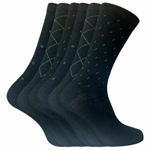 Men’s 6 Pack Dress Cotton Socks A set of cotton rich dress socks is an essential for any man’s sock drawer. In these set of men’s socks you will find these qualities as well as being a great value pack. These socks are cotton rich and soft, perfect for everyday wear. They have a stay up top at the top of the sock to ensure that they don’t fall down either. Pick from 3 coloured styles including stripes, argyles and plain black. They are a size 6-11 UK 39-45 eur 7-12 US, organised in a 6 pair pack and they are machine washable. Extra Product Details * 6 pair pack * Mens dress socks * Size 6-11 UK 39-45 eur 7-12 US * 80% cotton 10% nylon 7% polyester 3% lycra * 3 styles to choose between * Machine washable