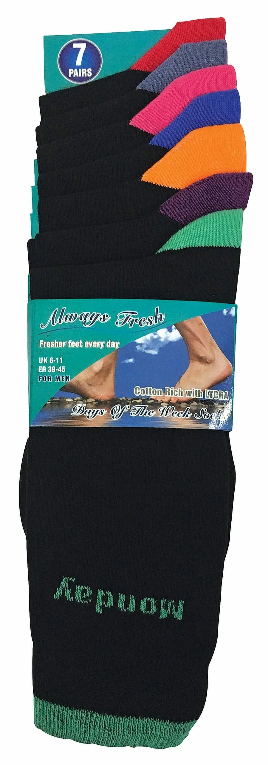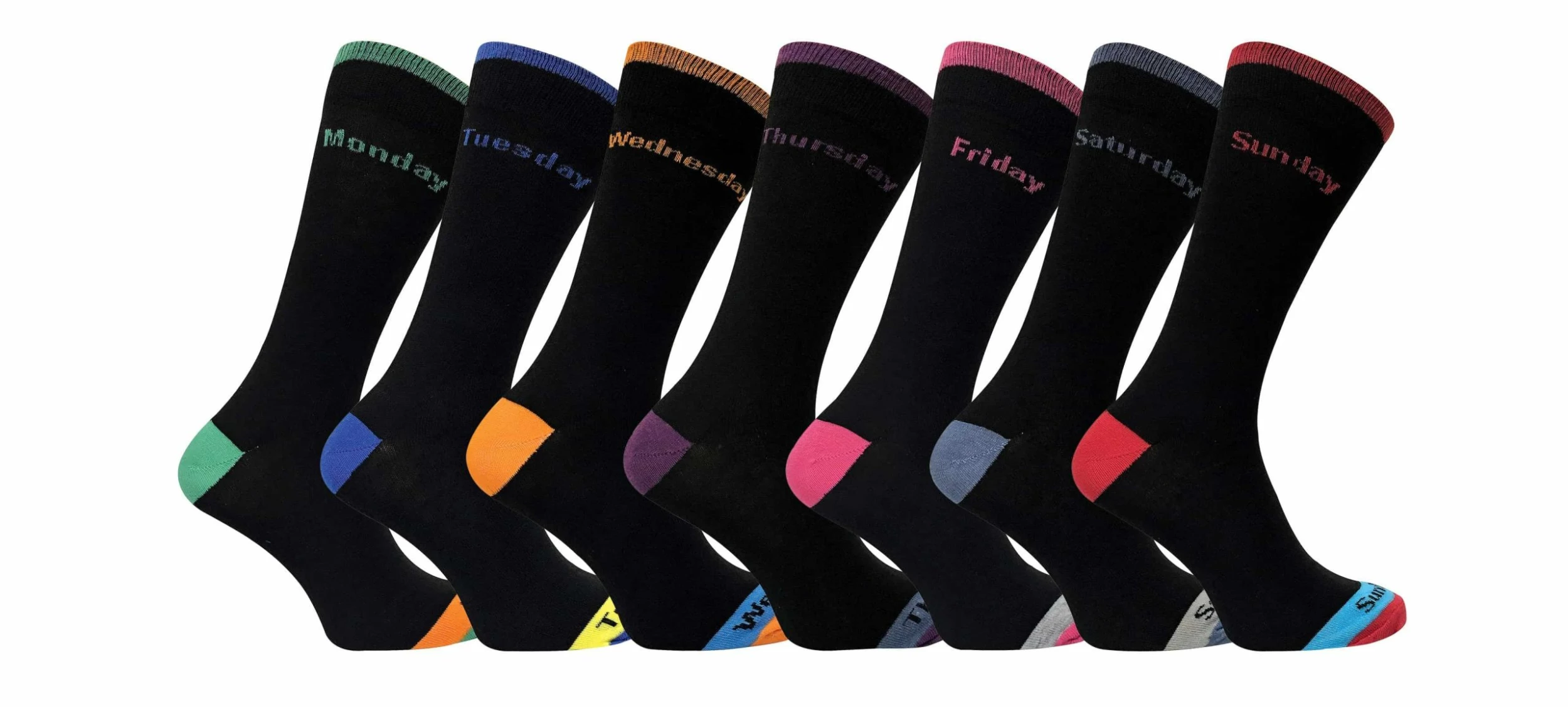 7 Days of the Week Socks Align your feet with the days of the week with this 7 pack of socks. As well as being a fun accessory to your feet thee socks are also cotton rich and are elaborate and colourful on their heel and toe. These socks say the days of the week at the top of the calf and flamboyantly displayed on the top of the toe. From Monday to Sunday they all display different colours to give your feet a healthy variety throughout the week, your Monday beginning with an orange / green combo and ending on a blue / red pattern on Sunday. These socks are also cotton rich so they can give a soft comfortable wear all year round. These socks are 55% cotton 23% nylon 20% polyester 2% elastane and are a size 6-11 UK 39-45 Eur 7-12 US. They are also machine washable. Extra Product Details – 7 pair pack – Days of the week – Coloured heel & toe – 55% cotton 23% nylon 20% polyester 2% elastane – 6-11 UK 39-45 Eur 7-12 US – Machine washable