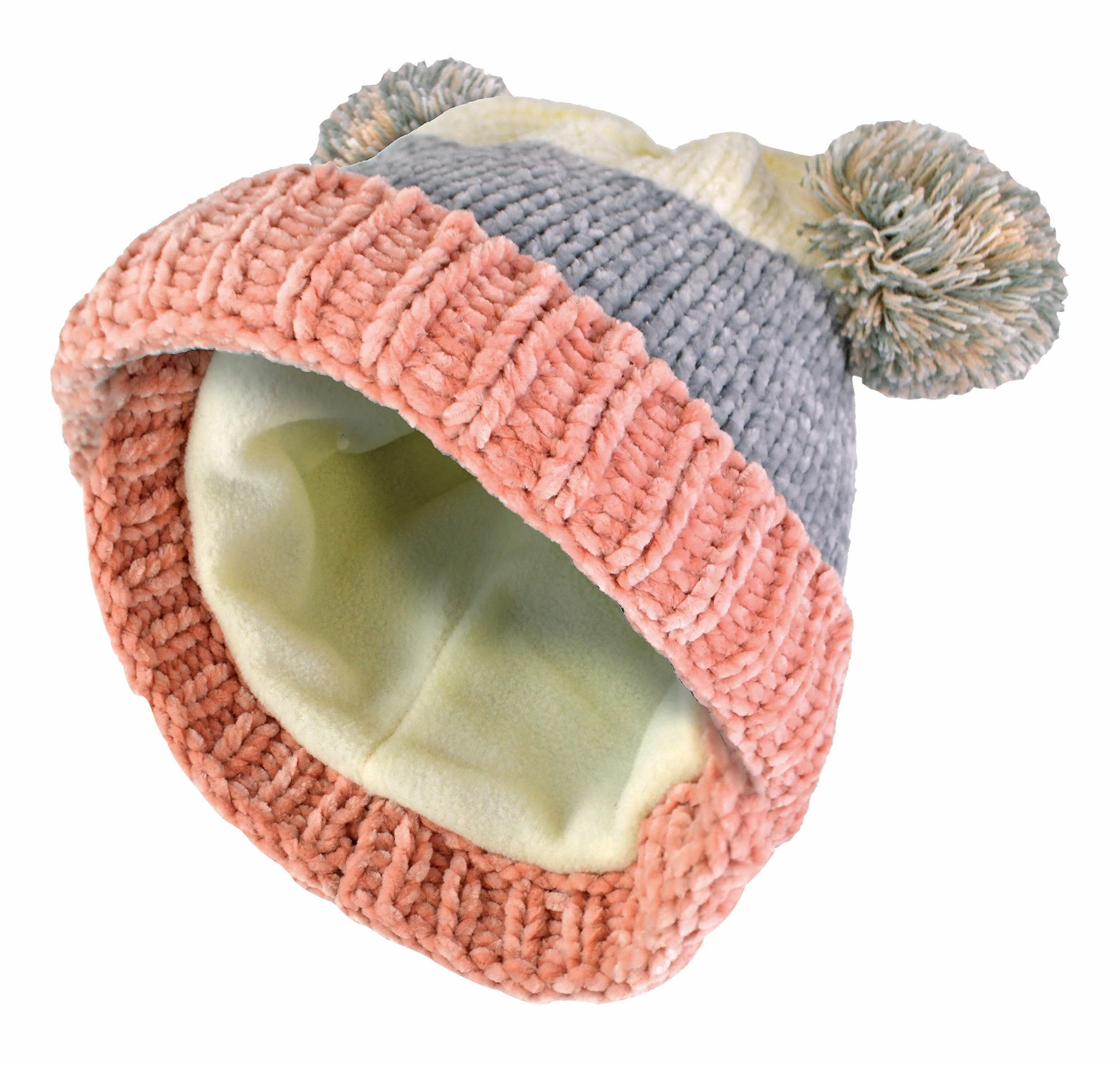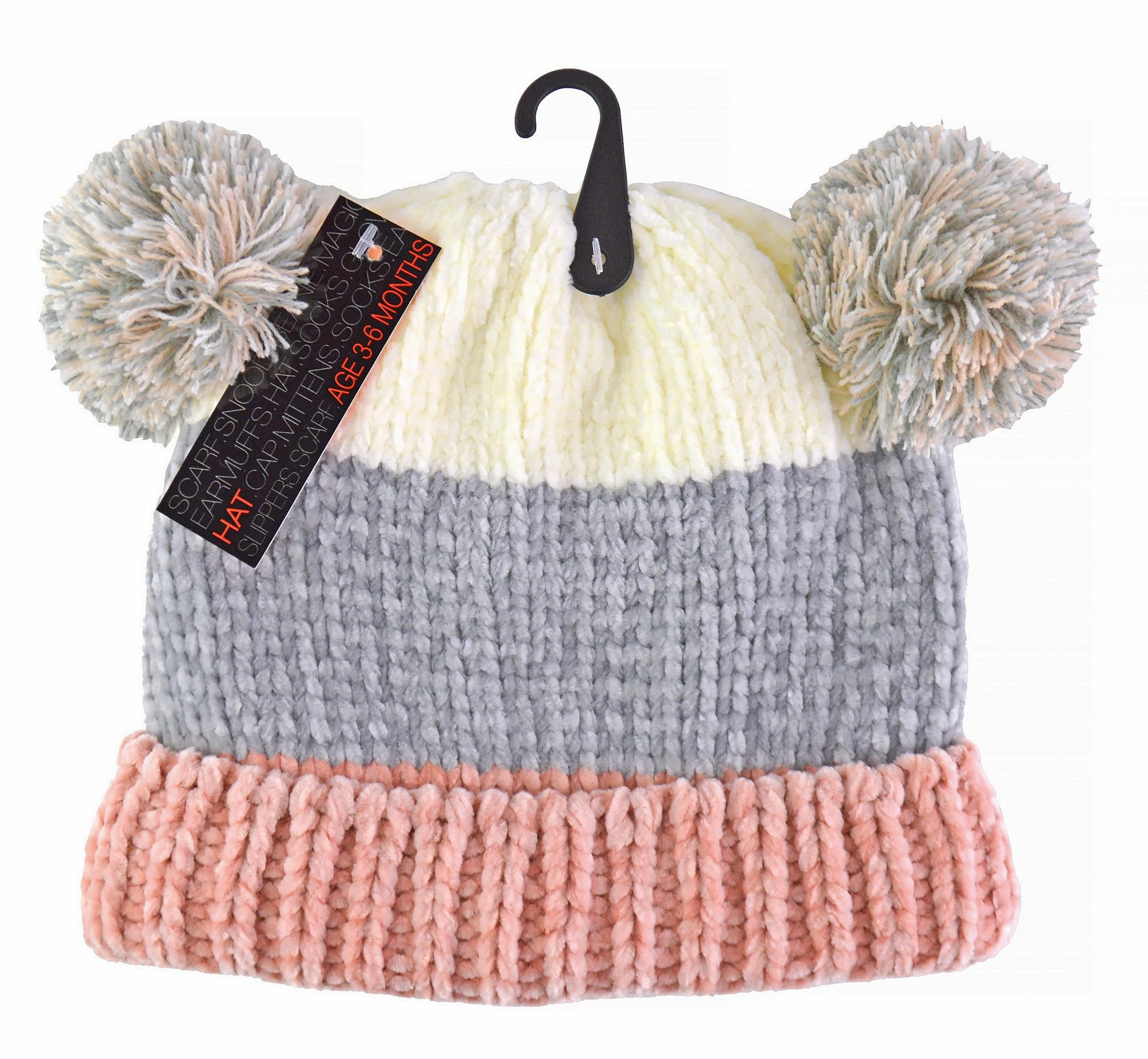 Baby Double Pom Pom HatFor your mini-me and youngest winter wonderlanders, this double pom pom beanie has been created to keep the little one warm and comfortable while you’re out in the cold. An extremely useful winter accessory for your baby, it will keep their head and ears warm during the winter months.The super soft and thick polyester material is skin-kindly to children, with no harm or uncomfortable feel to the child’s skin. With 2 sizes to choose from these hats are ideal from newborn until 6 months old.The bottom has an extra stretch turnover cuff to make sure that it fits your little one’s snuggly and comfortably without squeezing their head which will reduce irritation. This hat also comes with two adorable pom poms on the top so your baby can look cute all day long!The hat comes in one colour: White/Grey/Pink, are made from 100% Polyester and machine washable. They are available in 2 sizes: 0-3 months & 3-6 months.Extra Product DetailsWinter Beanie Hat for BabiesThick & Super Soft100% PolyesterTurnover CuffDouble Pom Poms2 Sizes AvailableVery ComfortableA Great WInter AccessoryMachine Washable