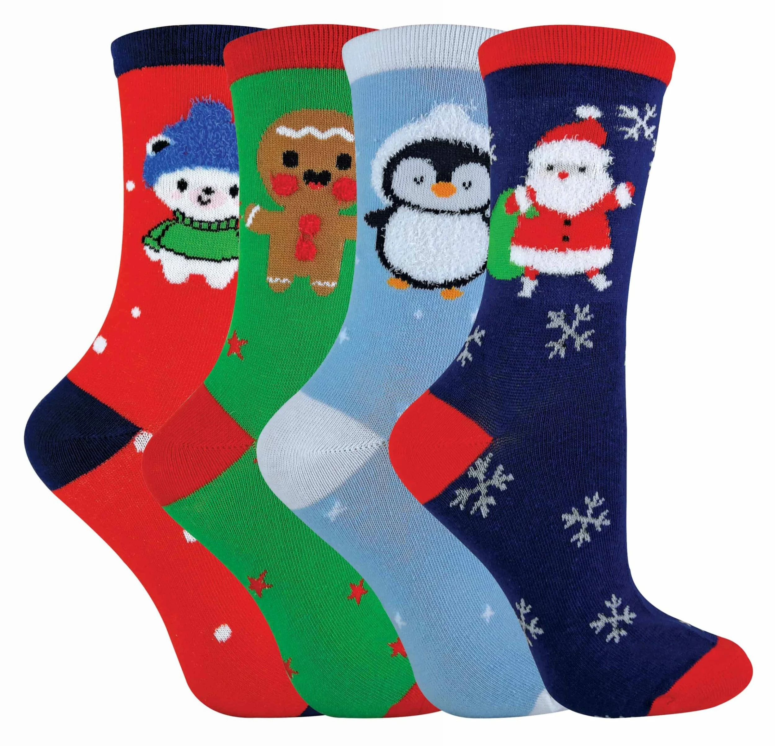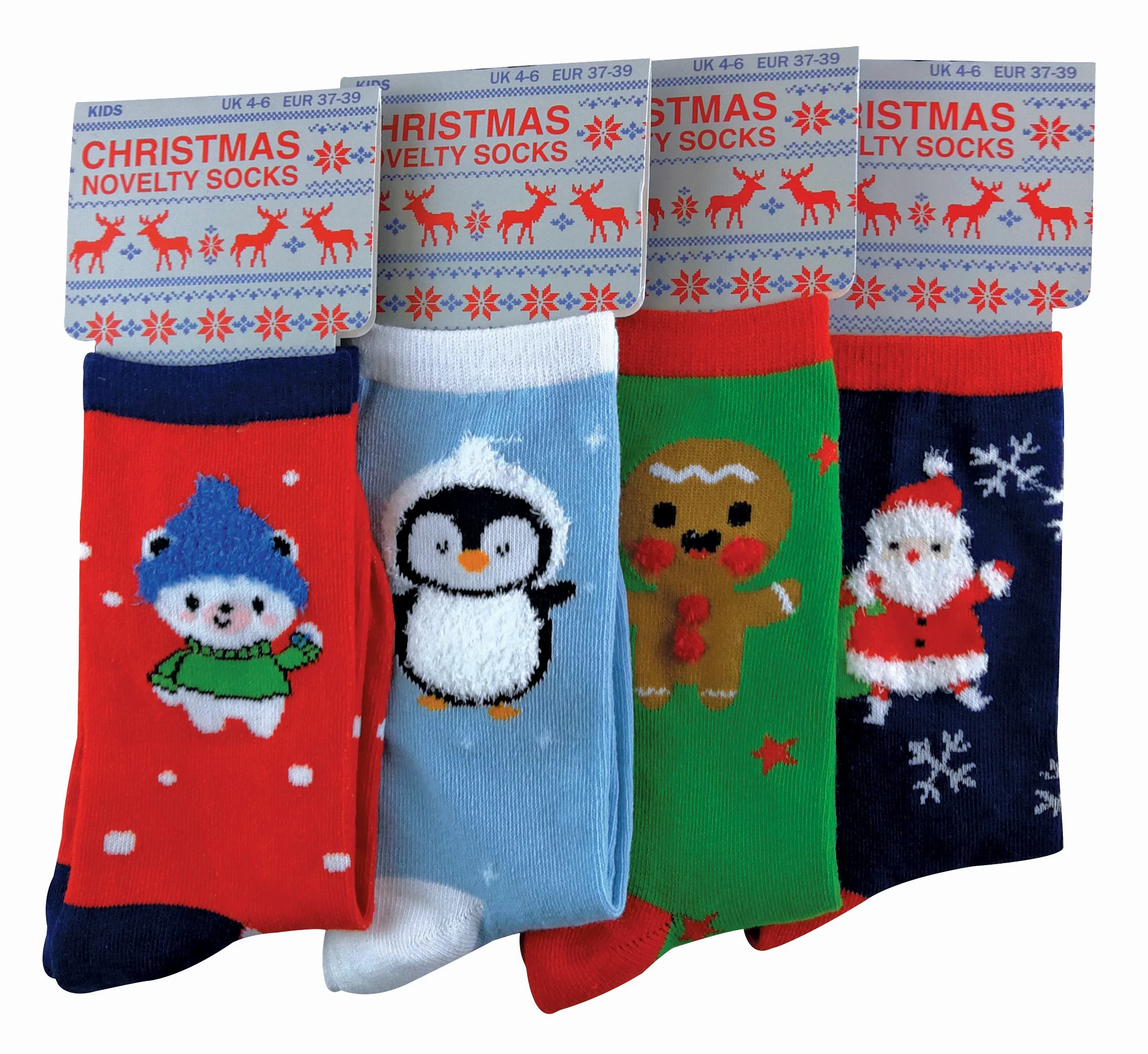 Kids Christmas Socks. If Christmas socks are starting to become a necessity in your household during December, then we can help you with our kids festive Christmas socks. In our 4 pack of kids Christmas socks there are 4 fun designs including penguins, polar bears, elves and Santa with his favourite reindeer Rudolph. Your child will also have soft comfortable feet as well as having festive feet as these socks are rich in cotton with a 70% cotton content. We also have 3 sizes for you to pick between so that they fit correctly and comfortably. These will also prove to be a great stocking filler on the day. They are also machine washable but it is advised to wash dark colours separately.