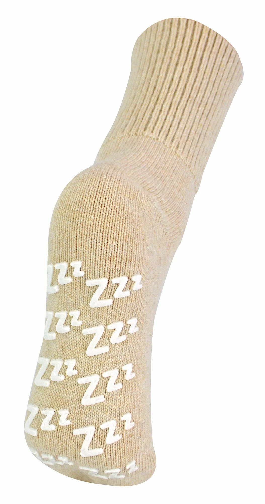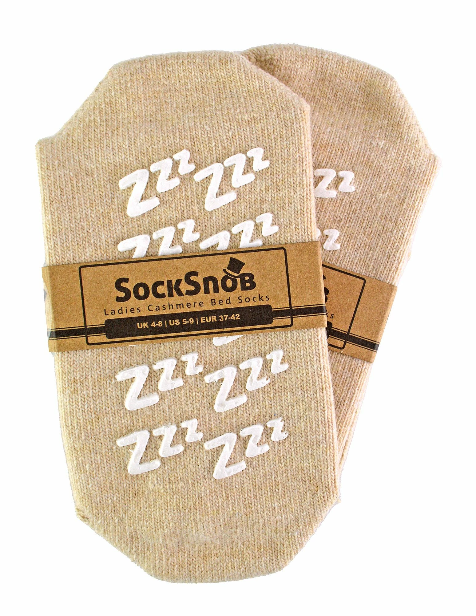Ladies Cashmere Bed Socks with GrippersWhen you’re spending that cosy night in during the colder months and you want to make sure you’re warm from head to toe, you’ll need to start at your feet. That’s where these Wool Cashmere Bed Socks come in! Super cosy and soft, these socks won’t let you down in winter.The special mix of wool & cashmere fibres create a perfect soft feel and ultimate warmth for your feet. These materials have natural thermal qualities and are ideal to be used as both night or lounge wear.These socks have a great patterned gripper sole of sleepy ZZZ’s, helping to keep you secure on slippery household flooring, such as wooden panels or laminate. They also show that these socks are definitely designed for napping on the sofa on those lazy afternoons.They come in two traditional colours: Beige & Grey with White anti-slip grips, and are available in Ladies size 4-8 UK. They are made of 40% Wool, 28% Viscose, 20% Polyamide, 10% Cashmere, 2% Elastane and are machine washable.Extra Product DetailsLadies Cashmere Bed SocksWool & Cashmere BlendSoft & Comfortable2 Colours AvailableZZZ’s Non Slip GrippersNatural Thermal PropertiesA Great GiftIdeal For Lounging & RelaxingOne SIze: 4-8 UKMachine Washable