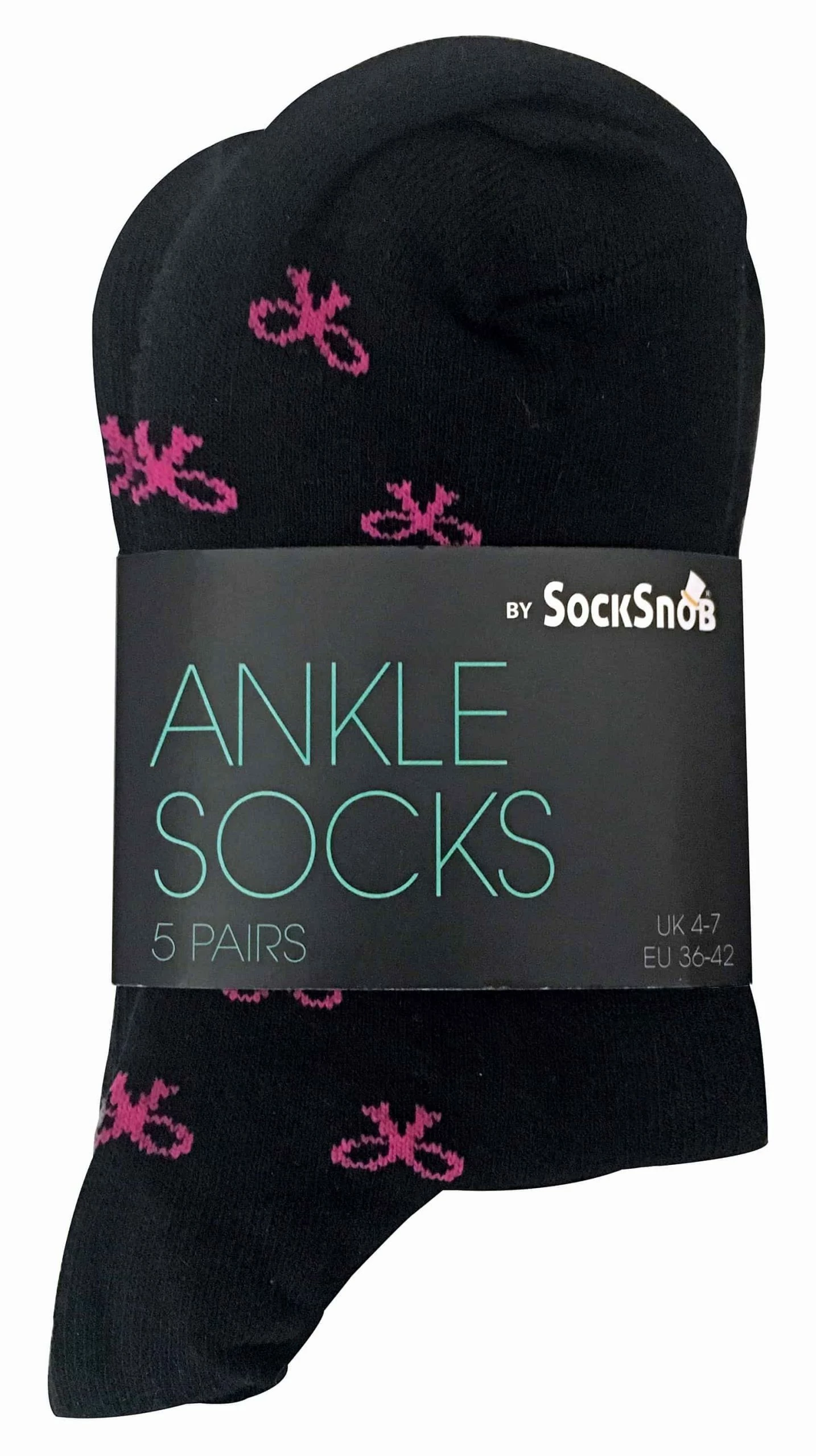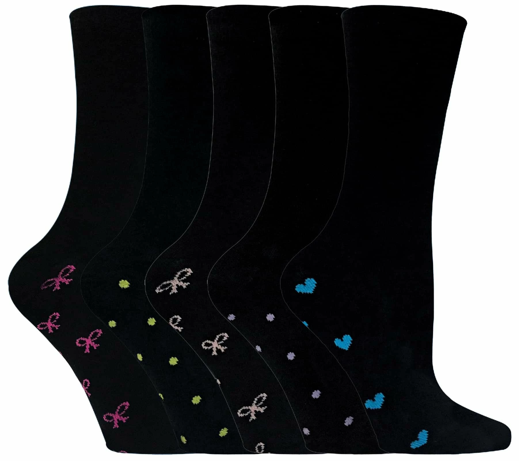 Ladies Black Patterned SocksIf you are looking for a set of simple but pretty ladies socks then these are a great pair for you to consider. They are not only pleasing to the eye but are also made with a soft natural cotton, so that your feet can be surrounded in softness all day long. They are also secure so that they stay up all day. The designs on the foot of the sock are a heart and bow design, a cute touch to an otherwise simplistic sock. These socks are available to purchase in a 5 pack and a 10 pack and are a size 4-7 UK. They are made from 80% cotton 18% polyamide and 2% elastane and are safely machine washable. Extra Product Details* Ladies socks*Cotton rich*Black socks with heart and bow design* Available in a 5 or 10 pack* Size 4-7 UK* 80% cotton 18% polyamide and 2% elastane* Machine washable