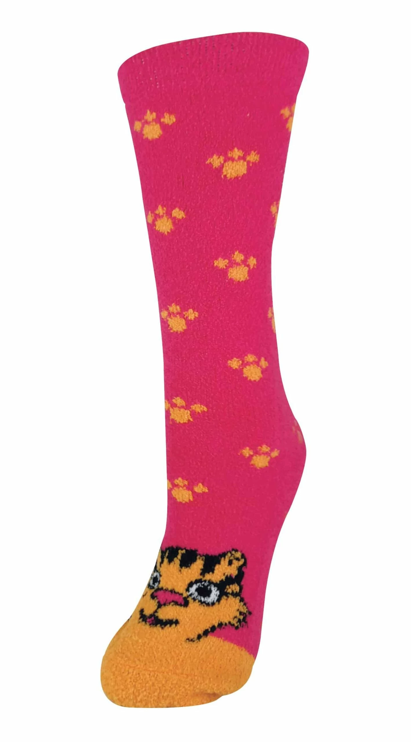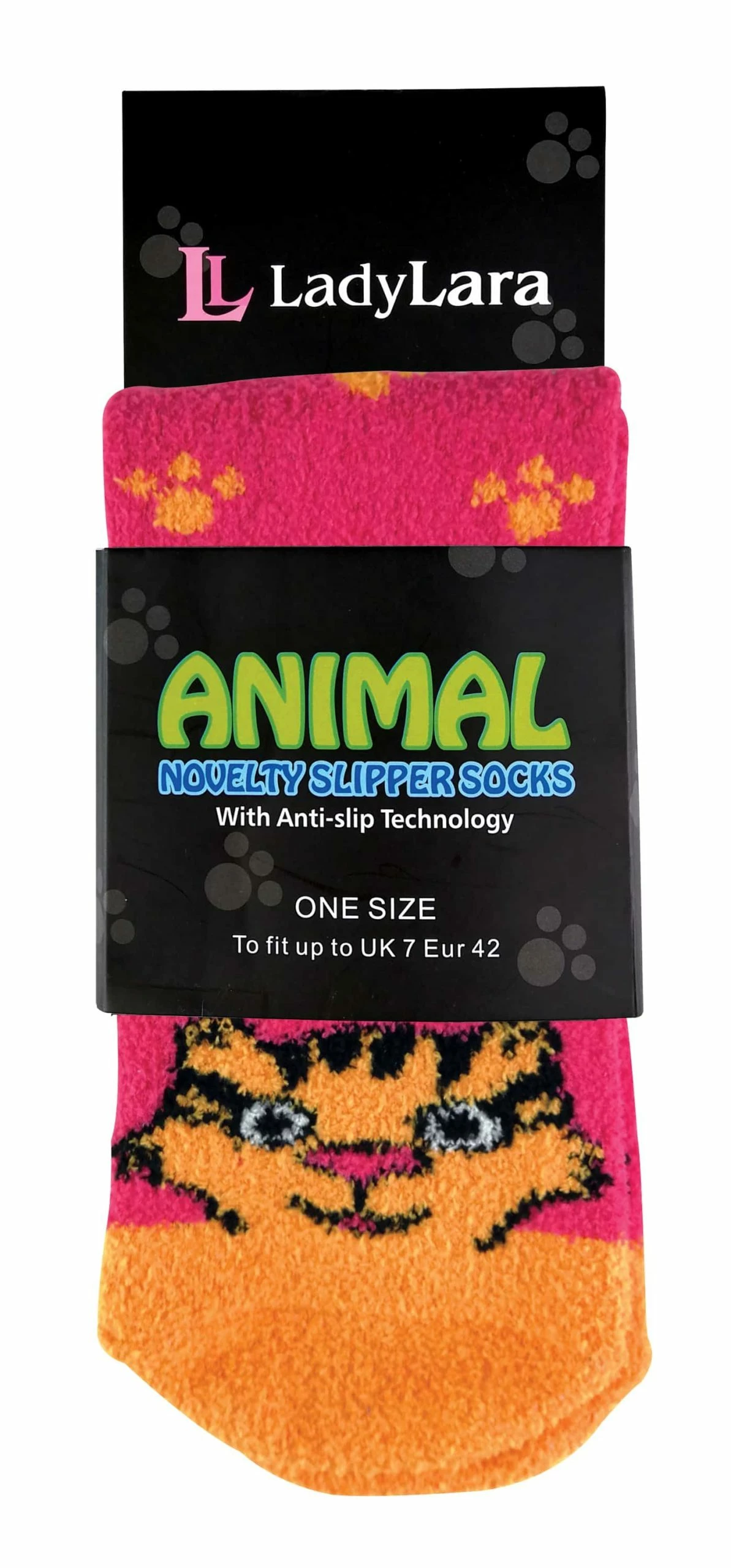 Ladies Novelty Animal Slipper Socks by Sock Snob Have your favourite animals on the end of your feet keeping your feet snuggly and warm indoors. These anti slip animal socks are fantastic for lounging around the house to use as bed socks or for walking on slippery surfaces. Keep your feet fun, safe and super cosy. Choose from styles that include a dog, cat, elephant, tiger, koala and a monkey. They all have different colours including blue, purple and orange and other colours to choose from. The animal face is knitted at the end of the foot, with animal paws and monkey hands riding up the leg, creating a real novelty animal pair of cosy fuzzy socks. These anti skid socks are also ideal for indoors as they have a non slip rubber grip on the bottom of the foot. This style of grip is simply just small dots. The grippers will provide better traction on indoor wood or tiled surfaces which would otherwise be hazardous and slippery. Additionally, these novelty animal socks are made of 98% polyester microfibre. This gives them that plush fluffy effect that gives them that soft touch, making your feet extra cosy. They’ll also hold the warm air close to your skin, keeping your feet warm when the cold winter weather hits. As gift ideas, these would be perfect for a pet lover or someone who loves animals in general. If you know someone who also enjoys home comforts then these socks will be perfect. For a friend or a family member like a mum, grandma, auntie or a teenage girl sister these would be great and would be guaranteed to put a smile on their face. The comfort top at the top of the socks adds extra comfort, making it less constrictive. This makes it less likely that nasty marks will appear on the top of your legs. These socks are available in 6 styles and are in a size 4-7 UK 5-8 US and 37-42 EU. They are made out of 98% polyester 2% nylon and they are machine washable.