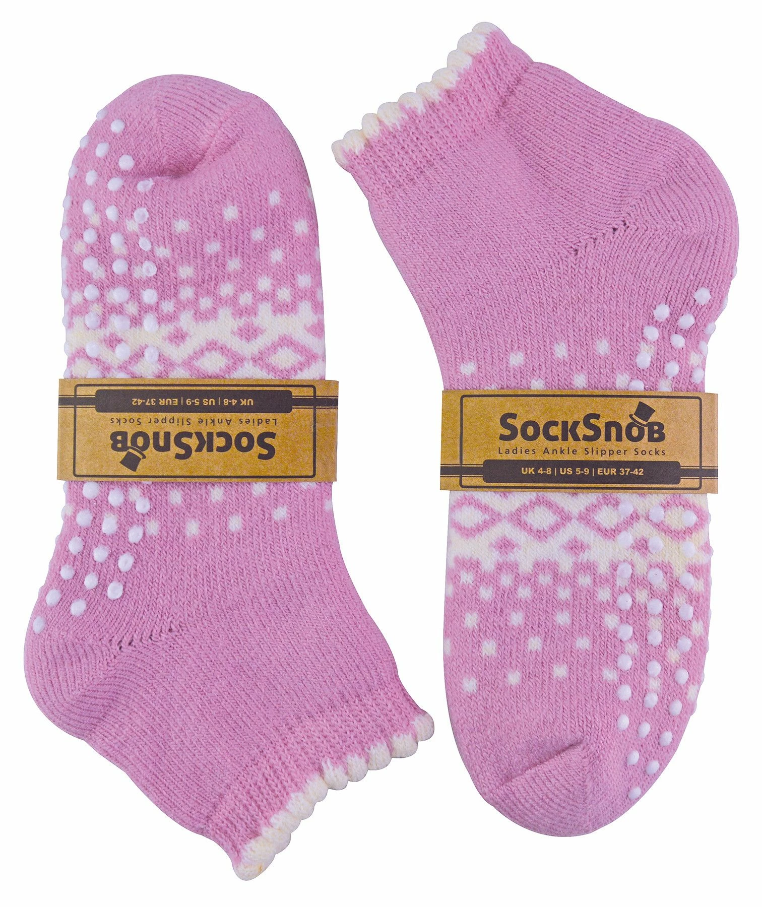 Ladies Ankle Slipper Socks With GrippersWhen you’re relaxing on the weeknights or weekends you want to be comfy as much as possible and sometimes a full length sock just won’t do, that’s where these Ladies Ankle Slipper Socks come in. With them being low cut they’ll be sure to keep just your feet warm especially as they’re made out of an Acrylic/Wool blend which are two of the warmest fibres around!They come with an anti-slip silicone gripped sole so you won’t be sliding around on those hard surface floors anymore! They would also make a great gift, Christmas present or even stocking filler for a friend or family member.While keeping you warm with their great Acrylic & Wool blend material they’re also super soft and kind to your skin so you won’t be getting any irritation from them while you’re lounging around on the sofa at the weekends. They also include some great and funky nordic type patterns for an added bit of style around the house!There’s two great colours to choose from: Pink & Charcoal, and are available in Ladies size 4-8 UK. They’re made from 65% Acrylic, 25% Wool, 8% Polyamide, 2% Elastane and are machine washable.Extra Product DetailsLadies Ankle Slipper SocksA Great Wool BlendSoft & Comfortable2 Colours AvailableNatural Thermal PropertiesA Perfect GiftFunky Nordic PatternsNon-Slip GrippersOne SIze: 4-8 UKMachine Washable