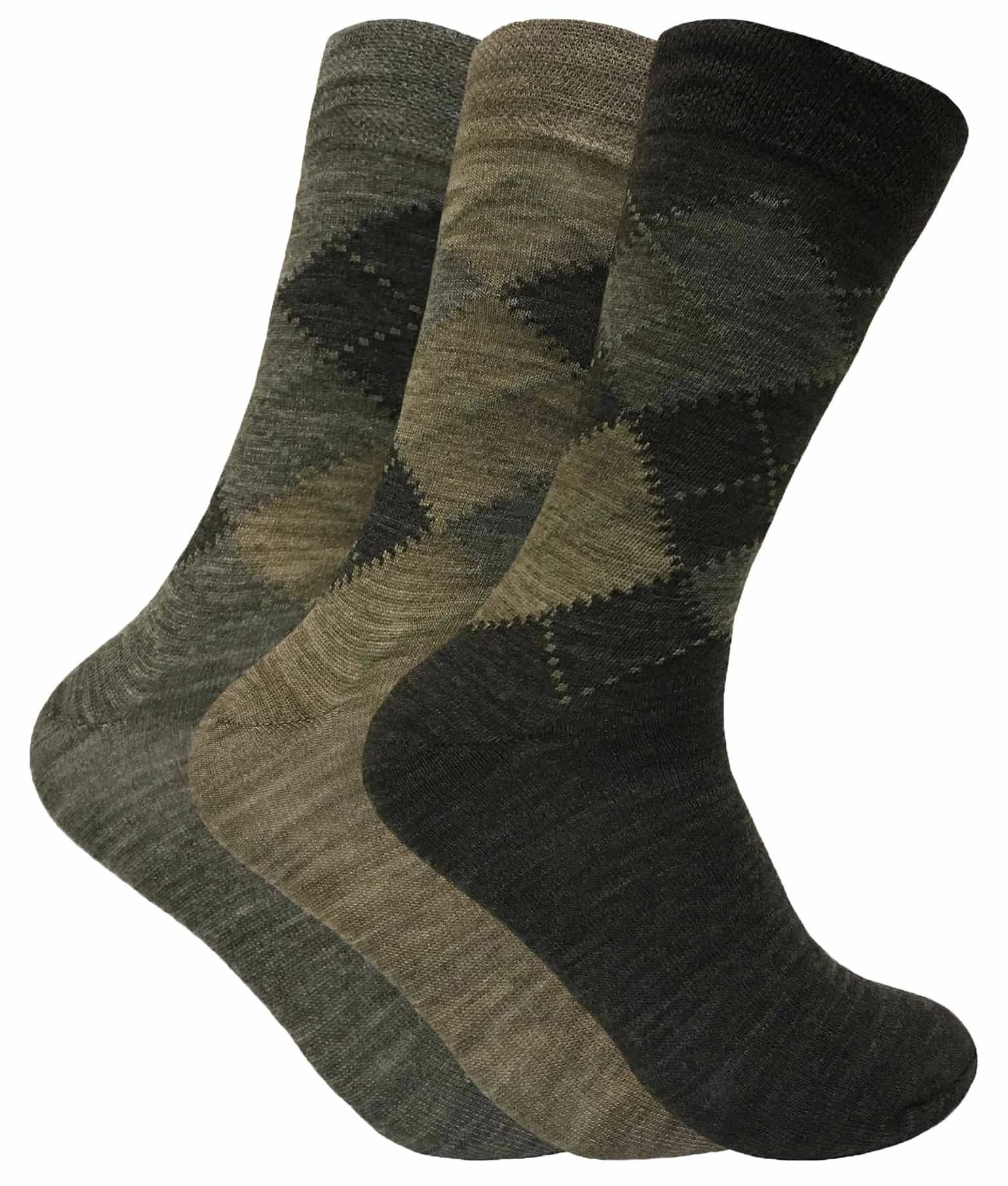 Mens Traditional Argyle Lamb’s Wool Socks A traditional argyle wool sock has always been considered as one of the essentials for mans sock drawer, especially if he is enjoying the great outdoors regularly. This 3 pack offers a soft touch on the foot, protection in rough terrains and warmth to trap the natural body heat that is created by your feet. A honeycomb knit at the top of the socks provides intense comfort around the legs whilst a wool blend provides a soft cushion for the foot. The lamb’s wool blend incorporated into the manufacturing of these socks gives them the thermal ability to keep your feet warm in cold temperatures for long periods of time, meaning you can enjoy the great outdoors in comfort and warmth for longer. The traditional argyle patterns available come in 2 options, a brown mix and a grey mix. One size is available in a 6-11 UK and they are easily machine washable. Extra Product Details * Lamb’s wool blend socks * 2 colours to choose between * Size 6-11 UK 39-45 eur 7-12 US * Advanced knitting technologies * Keep feet warmer for longer * Traditional argyle patterns * 55% Acrylic 25% Wool 18% Polyester 2% Elastane Lycra * Machine washable