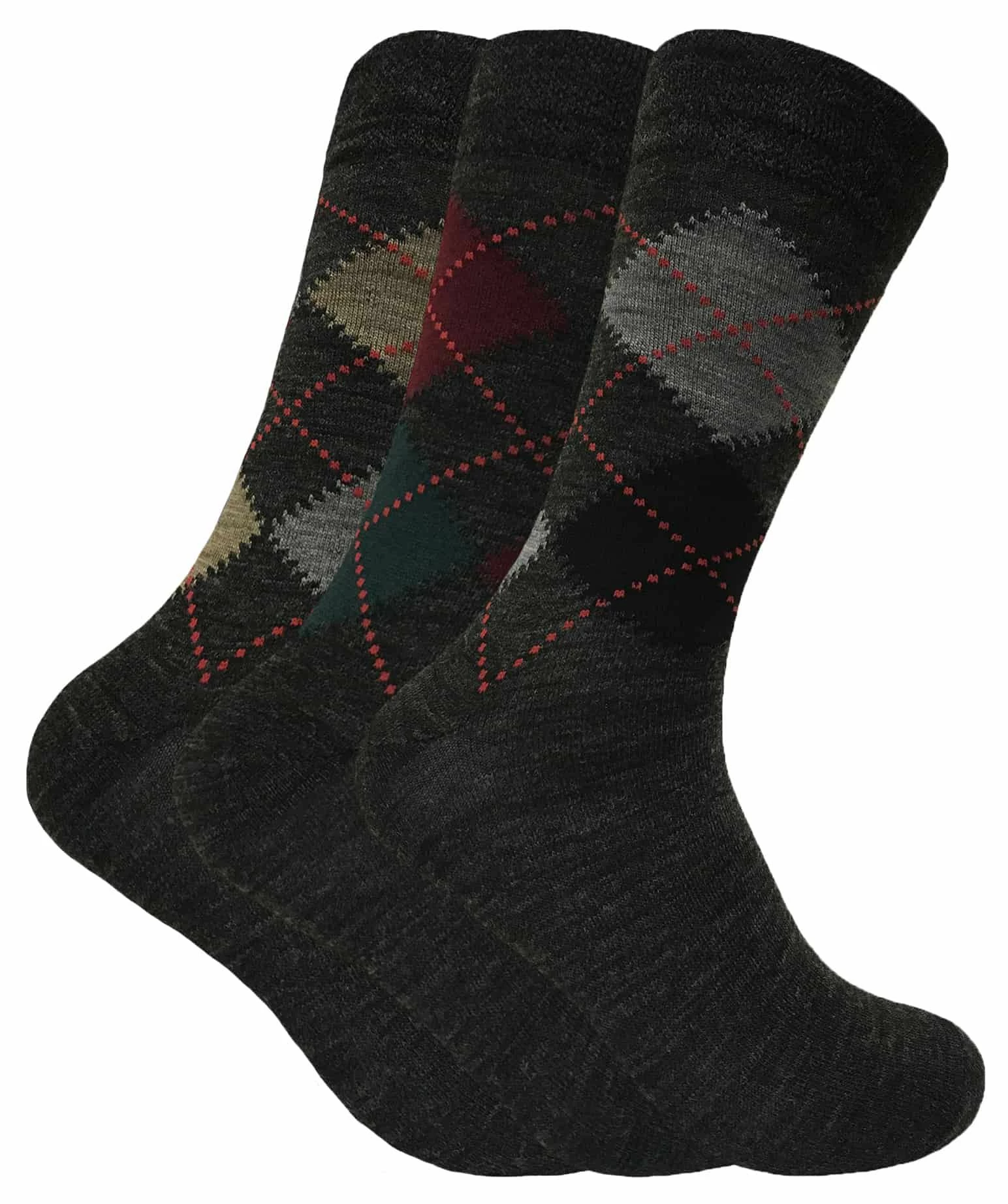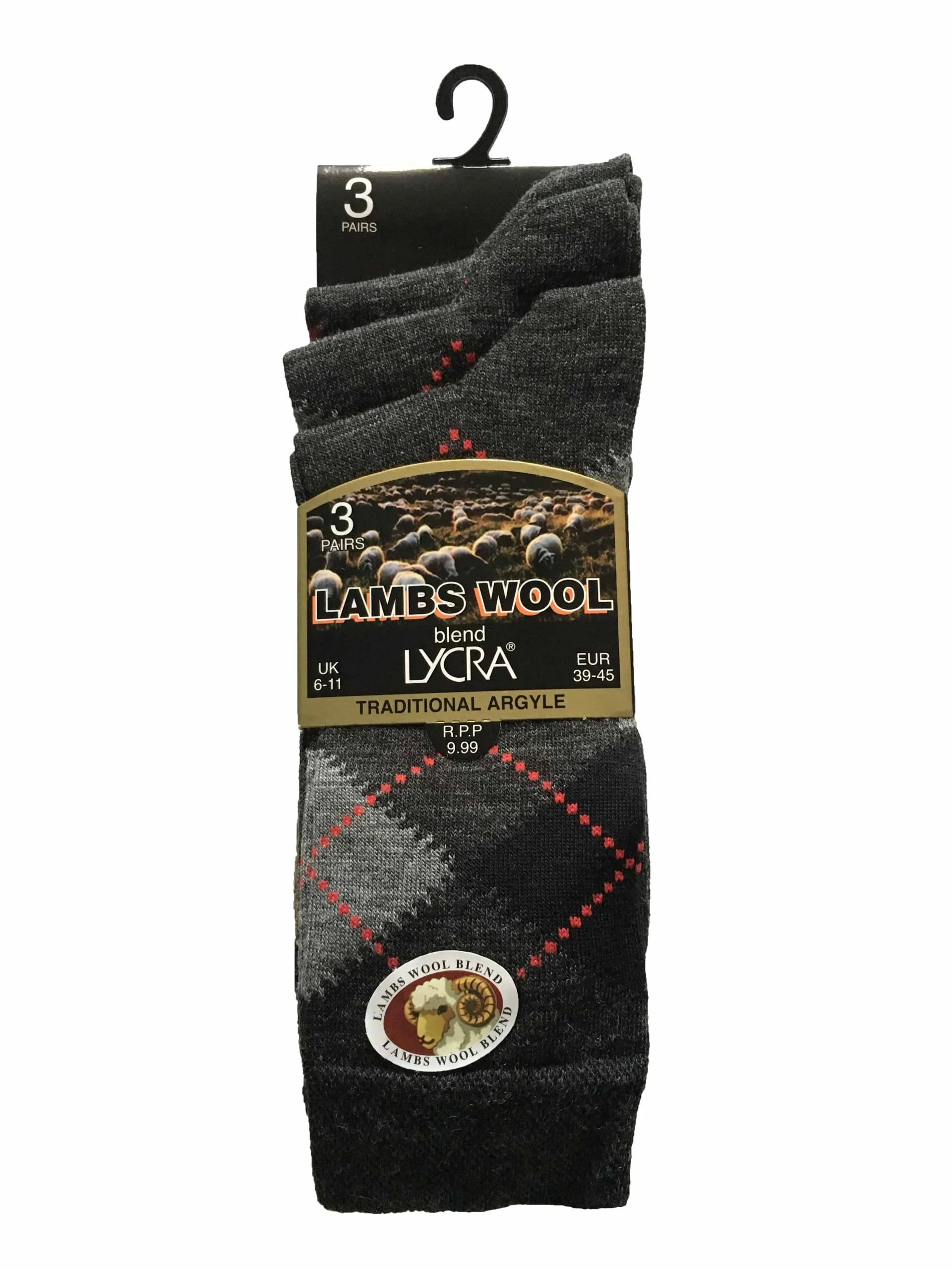 Mens Traditional Argyle Lamb’s Wool Socks A traditional argyle wool sock has always been considered as one of the essentials for mans sock drawer, especially if he is enjoying the great outdoors regularly. This 3 pack offers a soft touch on the foot, protection in rough terrains and warmth to trap the natural body heat that is created by your feet. A honeycomb knit at the top of the socks provides intense comfort around the legs whilst a wool blend provides a soft cushion for the foot. The lamb’s wool blend incorporated into the manufacturing of these socks gives them the thermal ability to keep your feet warm in cold temperatures for long periods of time, meaning you can enjoy the great outdoors in comfort and warmth for longer. The traditional argyle patterns available come in 2 options, a brown mix and a grey mix. One size is available in a 6-11 UK and they are easily machine washable. Extra Product Details * Lamb’s wool blend socks * 2 colours to choose between * Size 6-11 UK 39-45 eur 7-12 US * Advanced knitting technologies * Keep feet warmer for longer * Traditional argyle patterns * 55% Acrylic 25% Wool 18% Polyester 2% Elastane Lycra * Machine washable
