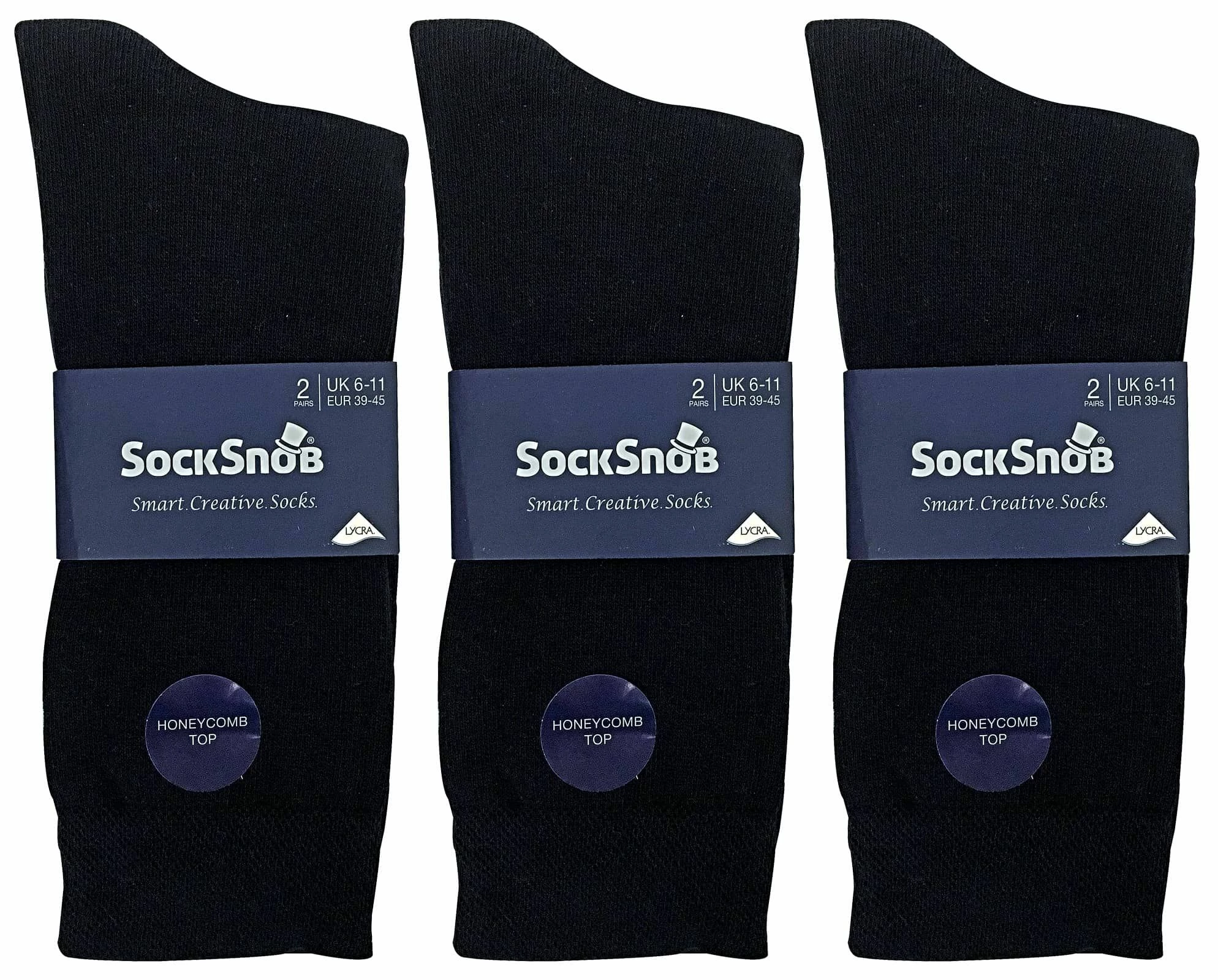 6 pairs of Men’s Sock Snob Premier Collection branded socks Some say that striped socks are the pinnacle of foot fashion for men… but what is a stylish pair of feet worth if they are comfortable? With our very own Sock Snob branded socks your feet will receive the pleasure of being trendy and comfortable at the same time thanks to Sock Snob’s smart creative technologies. There are 3 reasons why your feet can be comfortable all year round in our socks. Firstly, a honeycomb top styled design is placed at the top of the sock to reduce pressure hotspots and constriction rings around the legs, so great for those who need everyday socks to promote circulation. We also have a high cotton content of 80% in our branded socks, surrounding your feet in a natural softness throughout the day. 80% cotton also means high moisture wicking abilities and temperature control, keeping your feet warm in the winter and cool in the summer. There are also 7 modern styles to choose between, 5 striped style named after iconic cities with an additional 2 styles in plain black and black, navy and grey. These socks are machine washable and come in a 6 pair pack. Extra Product Details * 6 pair pack * 7 styles to choose between * Sock Snob branded * Great socks for any occasion * Honeycomb top to enhance comfort * 80% cotton 10% nylon 7% polyester 3% lycra * Size 6-11 UK 7-12 US 39-45 eur * Flat toe seam * Machine Washable