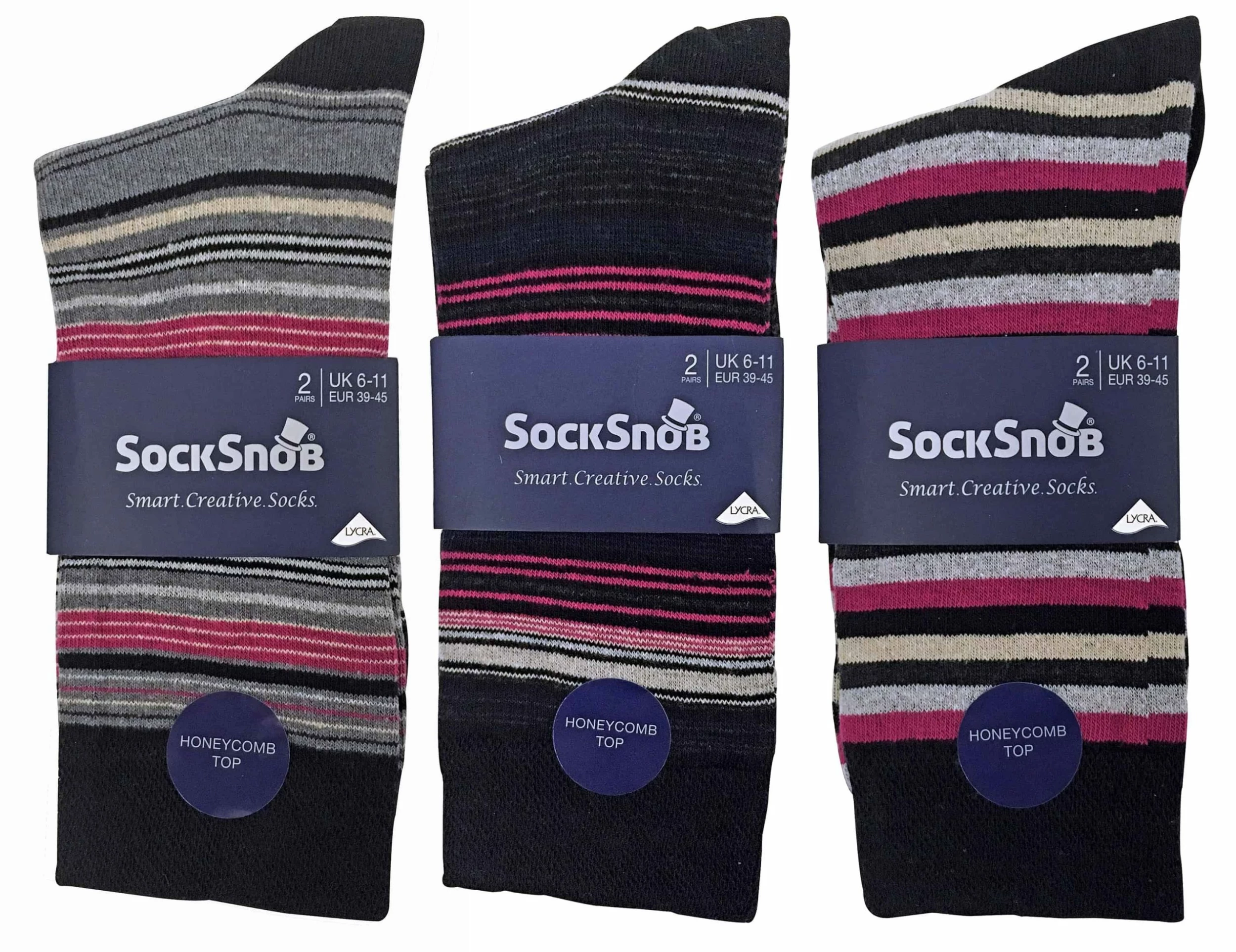 6 pairs of Men’s Sock Snob Premier Collection branded socks Some say that striped socks are the pinnacle of foot fashion for men… but what is a stylish pair of feet worth if they are comfortable? With our very own Sock Snob branded socks your feet will receive the pleasure of being trendy and comfortable at the same time thanks to Sock Snob’s smart creative technologies. There are 3 reasons why your feet can be comfortable all year round in our socks. Firstly, a honeycomb top styled design is placed at the top of the sock to reduce pressure hotspots and constriction rings around the legs, so great for those who need everyday socks to promote circulation. We also have a high cotton content of 80% in our branded socks, surrounding your feet in a natural softness throughout the day. 80% cotton also means high moisture wicking abilities and temperature control, keeping your feet warm in the winter and cool in the summer. There are also 7 modern styles to choose between, 5 striped style named after iconic cities with an additional 2 styles in plain black and black, navy and grey. These socks are machine washable and come in a 6 pair pack. Extra Product Details * 6 pair pack * 7 styles to choose between * Sock Snob branded * Great socks for any occasion * Honeycomb top to enhance comfort * 80% cotton 10% nylon 7% polyester 3% lycra * Size 6-11 UK 7-12 US 39-45 eur * Flat toe seam * Machine Washable