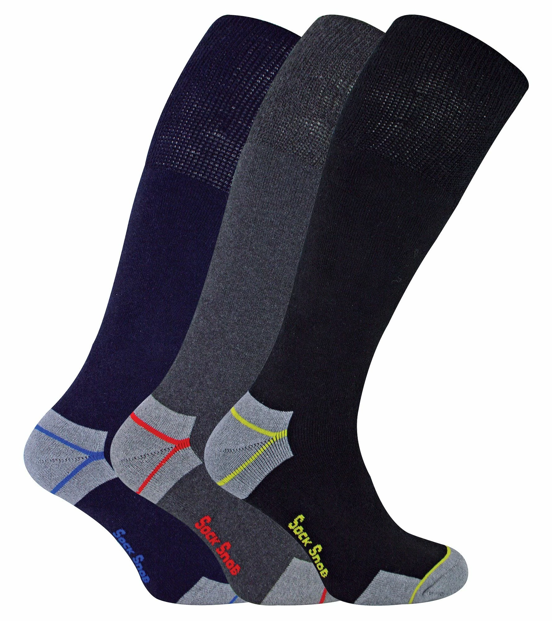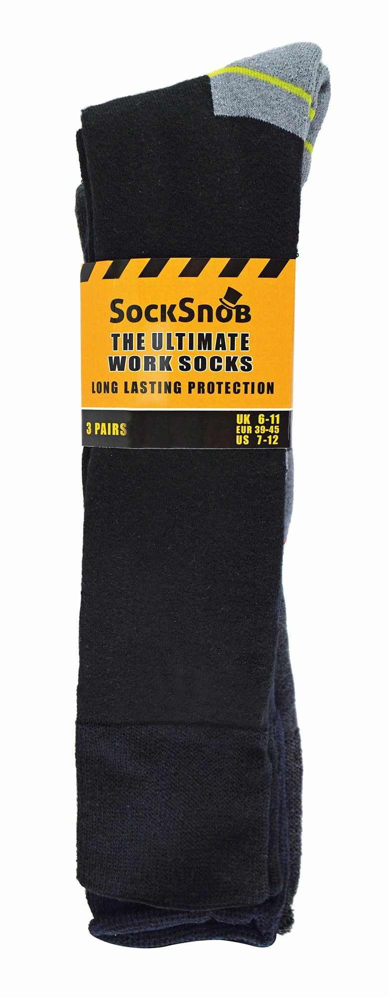 Sock Snob – Knee High Ultimate Work SocksAre you tired of your work socks falling apart and having to buy new ones every few months? Then we have the solution for you! Introducing Sock Snob Knee High Ultimate Work Socks. These long lasting, heavy duty socks are designed to keep your feet comfortable and dry while working!Our Ultimate Work Socks are great for wearing with steel toe capped boots and industrial boots as of their reinforced heel and toe. This is as well as their full terry cushioning which will absorb sweat and keep feet protected from the strain of a long and hard day of work. The extra long length makes them ideal for colder days and adds extra protection on the legs than the regular work sock.These work socks also have a true heel and toe to prevent movement in shoes and improve their overall fit. Their reinforced terry loops are therefore extra comfort and longevity as well as smooth toe seams for use with steel toe boots.These socks are made with cotton rich material so they’re breathable and moisture wicking too. They’re ideal for work environments where you spend most of your day on your feet like factory floors or construction sites and they’re designed to be durable enough to last through long shifts in tough conditions.These socks come in Men’s Sizes: 6-11 UK and 11-14 UK. They are also available in different pack quantities of 3, 6, 12 or 24 pairs and are made from: 55% Cotton, 23% Polyester, 20% Polyamide, 2% Elastane and are MAchine Washable.Extra Product DetailsMen’s Extra Long Work SocksHeavy Duty & Long LastingFor Steel Toe BootsFull Terry CushionReinforced Heel & ToeKnee High LengthCotton Rich FibresSmooth Toe Seam3, 6, 12 or 24 PairsSize 6-11 UK & 11-14 UKMachine Washable