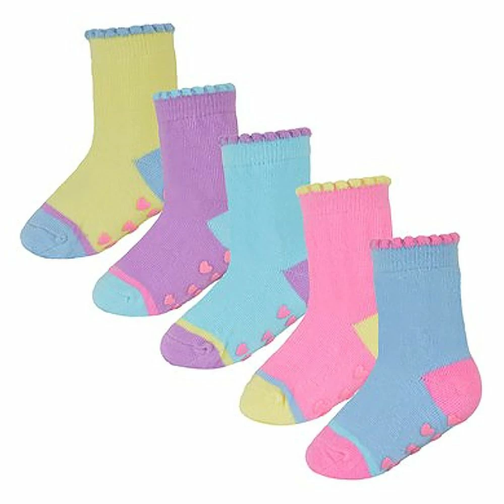 Baby Girls 10 Pack Heel & Toe Socks with GrippersIf your little ones are in need of a sock drawer top up but you need something to last them playing on hard surfaces then why not consider these great 10 Pair Value Pack Cotton Rich Socks with Grippers?Designed with you little princess in mind, these socks come with cute and colourful heel & toe patterns but with non-slip grippers on the bottom of each sock. This is to ensure that they don’t slip over on hard surfaces while playing around the house.These baby girl socks are Cotton Rich which will make sure that their feet remain super soft and comfortable throughout the day. With bright & funky colours throughout this 10 pack, there’s plenty to keep them going.These socks come in 2 different styles. One pack includes: Pinks, Purple & Whites all with funky grips. The other includes: Yellow, Pink, Blue, Purple & Light Blue, all with colourful grips as well.These socks come in 10 pairs and different 2 styles. They are available in 3 sizes: 0-6 Months, 6-12 Months & 12-24 Months. They are made from 78% Cotton; 20% Polyester; 2% Elastane and are Machine Washable.Extra Product Details10 Pack Baby Socks With GripsCotton Rich MaterialAnti-Slip Grippers2 Styles To Choose FromSoft & ComfortableBright & Funky Colours5 Different Colours Per Pack78% Cotton; 20% Polyester; 2% Elastane3 Size OptionsMachine Washable