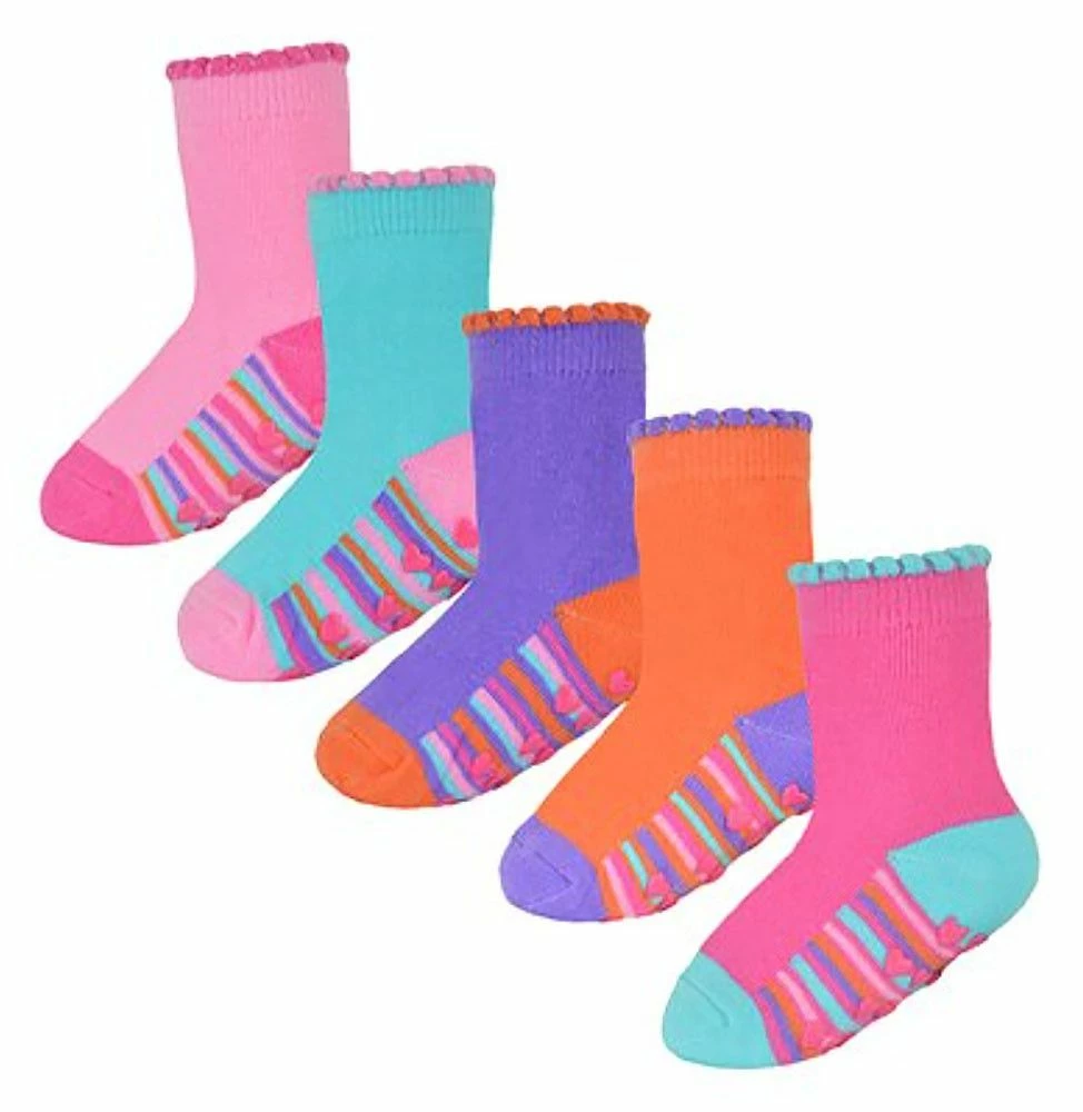Baby Girls 10 Pack Heel & Toe Socks with GrippersIf your little ones are in need of a sock drawer top up but you need something to last them playing on hard surfaces then why not consider these great 10 Pair Value Pack Cotton Rich Socks with Grippers?Designed with you little princess in mind, these socks come with cute and colourful heel & toe patterns but with non-slip grippers on the bottom of each sock. This is to ensure that they don’t slip over on hard surfaces while playing around the house.These baby girl socks are Cotton Rich which will make sure that their feet remain super soft and comfortable throughout the day. With bright & funky colours throughout this 10 pack, there’s plenty to keep them going.These socks come in 2 different styles. One pack includes: Pinks, Purple & Whites all with funky grips. The other includes: Yellow, Pink, Blue, Purple & Light Blue, all with colourful grips as well.These socks come in 10 pairs and different 2 styles. They are available in 3 sizes: 0-6 Months, 6-12 Months & 12-24 Months. They are made from 78% Cotton; 20% Polyester; 2% Elastane and are Machine Washable.Extra Product Details10 Pack Baby Socks With GripsCotton Rich MaterialAnti-Slip Grippers2 Styles To Choose FromSoft & ComfortableBright & Funky Colours5 Different Colours Per Pack78% Cotton; 20% Polyester; 2% Elastane3 Size OptionsMachine Washable