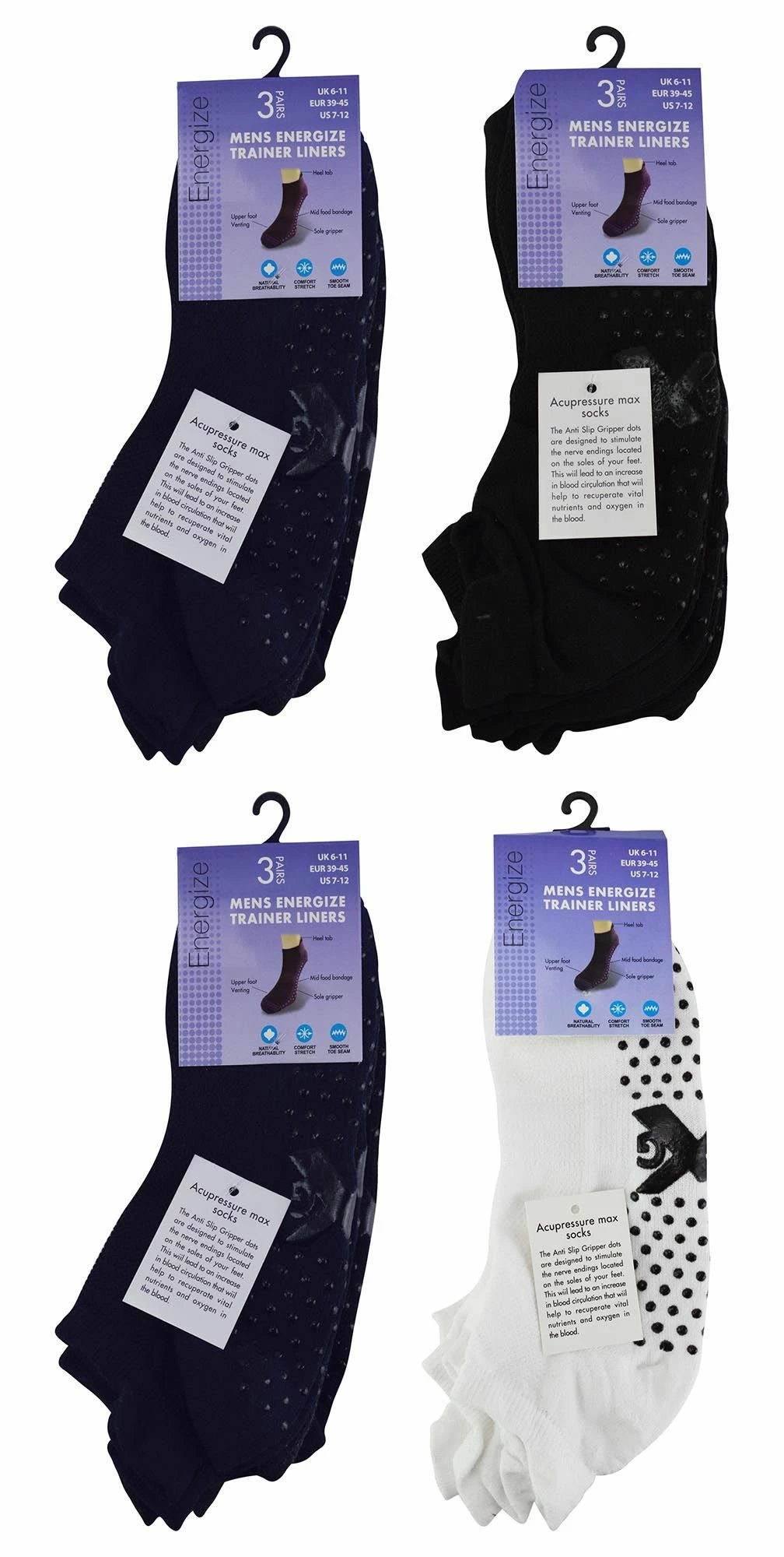 12 Pack Mens Energize Trainer SocksWhen you’re out doing your morning run or maybe some other sort of exercise you’ll need to make sure your feet have maximum support and comfort while you’re working out. These 12 Pairs of Men’s Energize Trainer Socks are ideal with all the properties they have to offer in making working out as smooth and comfy as possible.These socks have natural breathability so that there’s less sweat and irritation and more comfort. They also include upper foot venting to also help reduce sweat and add to them being breathable.They have anti-slip sole gripper dots that are designed to stimulate the nerve endings located on the soles of your feet which will increase blood circulation. It also makes sure they grip properly to your trainers.A heel tab at the top is also part of these socks to ensure they stay up no matter what. The tab also helps reduce the chance of blisters. They even have a flat smooth toe seam for extra comfort and less irritation.To make sure these socks are comfy and fit to the contours of your foot and stay there during use they have a comfort stretch so they stay snug around your feet.These socks are a 12 pack with Black, White, Navy and Charcoal included. They are Men’s One SIze 6-11 UK, are made from 55% Cotton, 43% Polyester & 2% Elastane and are fully machine washable at 40.Extra Product DetailsMen’s Trainer SocksAnti-Slip Sole GrippersCotton Rich FibreMaximum ComfortSoft & SnugIdeal For ExerciseLong LastingReduced Irritation4 Colours Per 12 PackMen’s One SIze 6-11 UKMachine Washable